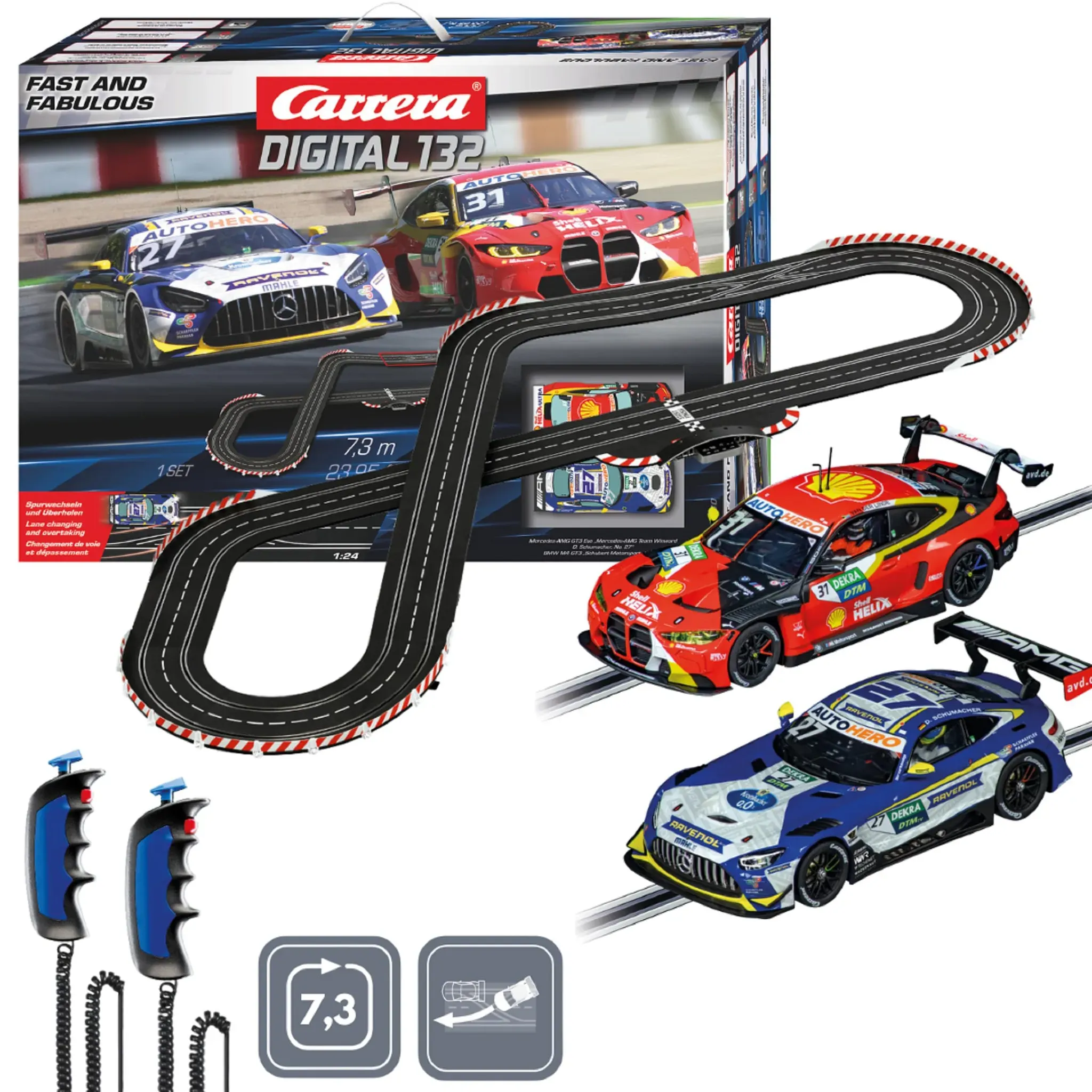 Spielzeugautos Spielzeugfahrzeuge Spielzeug Rennbahn Spielzeuge - EAN:4007486300309 - Auf der Rennbahn DTM Fast and Fabulous€ aus der Carrera-Serie DIGITAL 132 gehen zwei deutsche DTM-Superstars in Rennen. Auf der 7,3 Meter langen Autorennbahn duellieren sich der Mercedes-AMG GT3 Evo des Teams Winward und der Rennwagen aus dem Hause BMW M4 GT3 aus dem Team Schubert Motorsport. David Schumacher, der Sohn des Ex-Formel 1-Piloten Ralf Schumacher gab im blau-weiß-gelben Mercedes vom Team Winward sein DTM-Debut. Im schwarz-rot-gelben BMW M4 mit der Nummer 31 sitzt der südafrikanische Shooting-Star Sheldon van der Linde. Auf der Rennstrecke mit Autorennbahn- und Safetycar-Funktion sind nervenaufreibende Rennduelle mit Freunden und Familie vorprogrammiert. Dank Überholung per Knopfdruck können Fahrer im direkten Duell zeigen, was sie draufhaben. - gefunden von Kelkoo Das Carrera - 20030030 - DIGITAL 132 Rennsport Set mit Mercedes AMG GT3 EVO & BMW M4 GT3 bietet ein spannendes Duell zweier Top-Fahrzeuge. ![]() ![]() Carrera - 20030030 - DIGITAL 132 I Rennsport I Set I Enthält Mercedes AMG GT3 EVO & BMW M4 GT3 I Authentisches DI Rennvergnügen I Einfache Einrichtung & Lagerung I Maßstab 1:32
