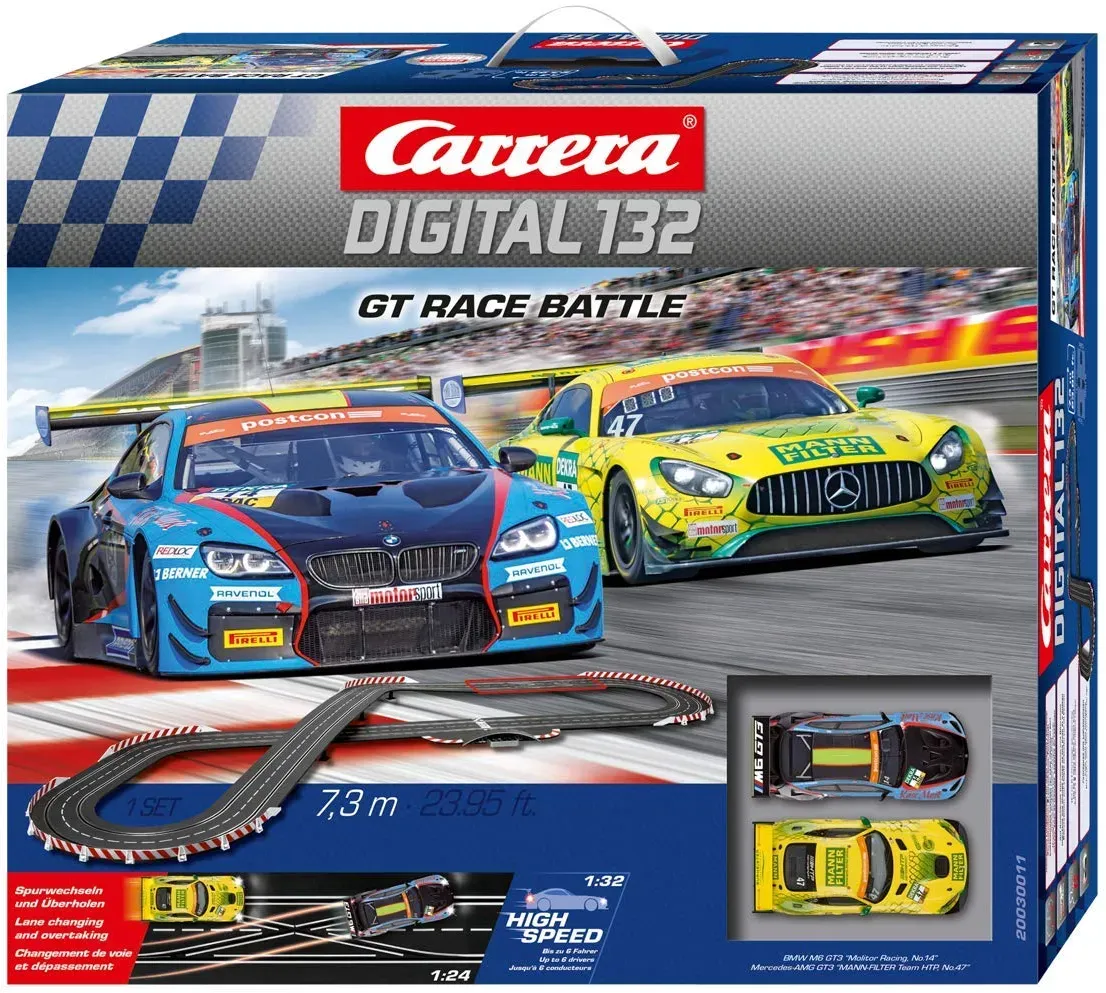Kategorie: Carrera - Carrera - GTIN:4007486300309 - RENNSPORT - Das Set enthält einen Mercedes-AMG GT3 EVO vom Team Winward und einen BMW M4 GT3 vom Team Schubert Motorsport. DDEBüT - Das DTM-Debüt gab David Schumacher, Sohn des ehemaligen Formel-1-Piloten Ralf Schumacher, im blau-weiß-gelben Mercedes vom Team Winward. DUELL ACTION - Mit Hilfe der beiden Handregler haben die Piloten Sieg und Niederlage selbst in der Hand und nutzen die Doppelweichen elegant zu ihrem Vorteil. Ghost- und Safety-Car-Funktionen sowie eine für jedes Fahrzeug separat programmierbare Geschwindigkeit und Bremswirkung sorgen für noch authentischeren Rennspaß. Bis zu 6 Fahrer können gleichzeitig mit weiterem Zubehör an der Bahn antreten. EINFACHE EINRICHTUNG UND LAGERUNG - Das Set enthält alle notwendigen Teile für eine schnelle und einfache Einrichtung. Sobald der Spielspaß vorbei ist, lässt sich alles leicht abbauen und kompakt verstauen. So bleibt die Rennbahn immer ordentlich und bereit für das nächste Rennen. WIRKLICHKEITSNAHE RENNERFAHRUNG - Mit den originalgetreuen Nachbildungen der DTM-Rennwagen Mercedes-AMG GT3 EVO und BMW M4 GT3 und der detaillierten Rennstrecke bringt dieses Set die Spannung und Atmosphäre eines echten DTM-Rennens ins heimische Wohnzimmer. Ein Muss für jeden Rennsport-Fan und Sammler von Modellrennwagen., Hersteller: Carrera Toys GmbH - 286,03 Euro bei Amazon Marketplace Toys - gefunden von billiger.de Ein Set, das mit zwei ferngesteuerten Slotcars und der Möglichkeit für bis zu 6 Spieler viel Rennspaß verspricht. ![]() ![]() Carrera DIGITAL 132 GT Race Battle Autorennbahn Set 2 ferngesteuerte Slotcars für drinnen Premium-Rennbahn im originalgetreuen Design bis zu 6 Spieler