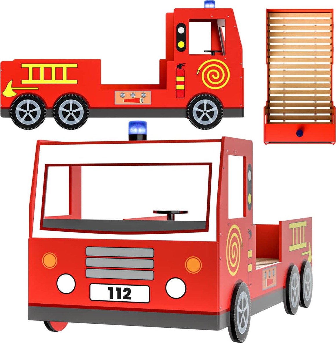 5 Händlerangebote bei billiger.de - Kategorie: Kinderzimmermöbel - CASARIA - Ausstattung & Funktionen Funktionen , aufgesetzten 3D-Rädern, Maßangaben Breite Liegefläche , 94.5 cm, Länge Liegefläche , 205 cm, Breite , 94.5 cm, Länge , 205 cm, Höhe , 103 cm, Gewicht , 0 kg, Hinweis Maßangaben , 205 cm x 94,5 cm x 103 cm, Material Materialzusammensetzung Bezug , Holz, Farbe Farbe , Rot, Allgemein Ausführung , Feuerwehrbett, Lieferung & Montage Lieferumfang , 1x Kinderbett mit Lattenrost/ohne Matratze,Dekoration nicht im Lieferumfang enthalten,1x Aufbauanleitung + Montagematerial, Der Versand erfolgt in 3 XXL Paketen, Sonderversand Sperrgut, Hinweise Warnhinweise , Achtung!Nicht für Kinder unter nNur für den Innenbereich.Erstickungsgefahr. Kleinteile und Verpackung von Kindern fernhaltenAufbau nur durch Erwachsene, - GTIN:4250525325607 ![]() ![]() CASARIA® Kinderbett 90x200cm mit Rausfallschutz Lattenrost 120kg belastbar 3D Leuchte Sirene Lenkrad Feuerwehr Bett Jugendbett Juniorbett Autobett Rot