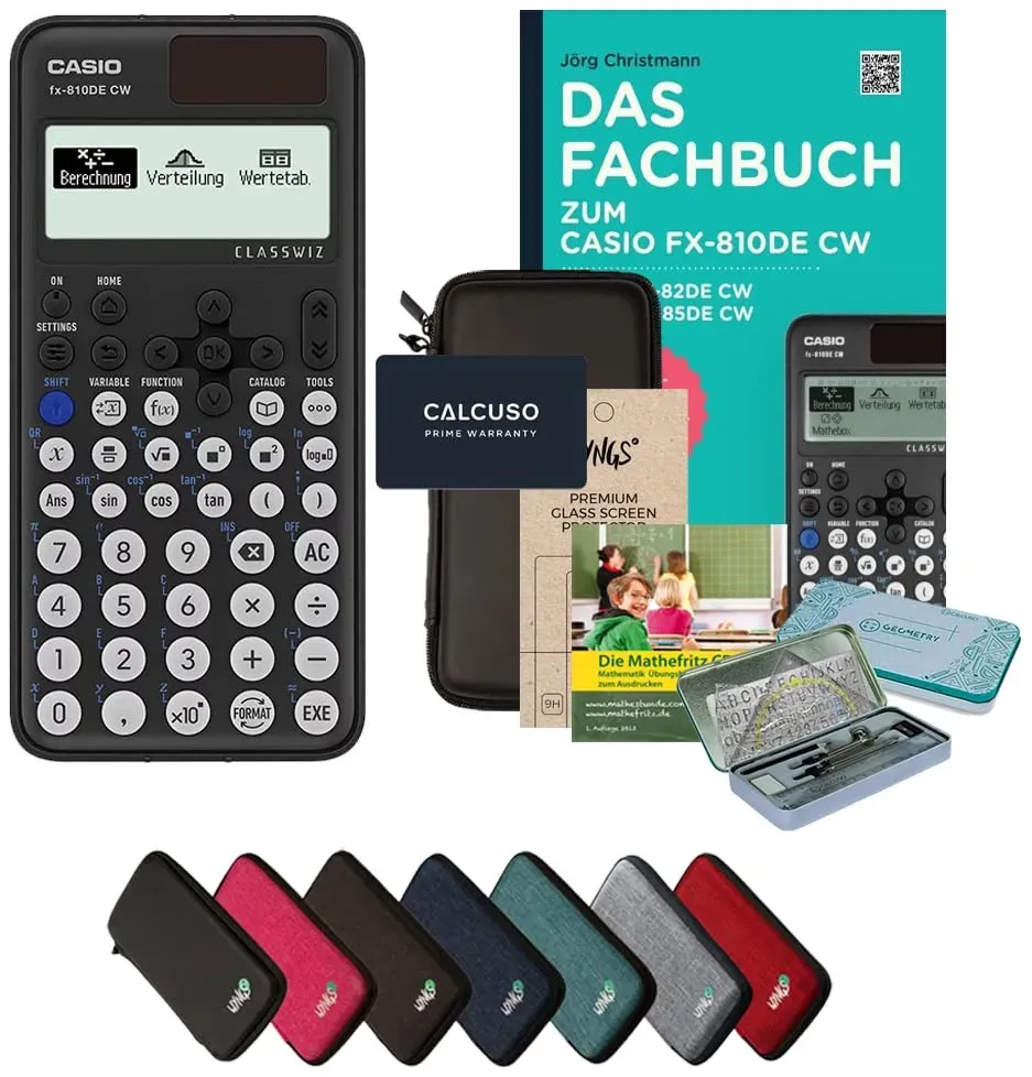 Kategorie: Taschenrechner - Casio - GTIN:4062401003581 - Das Smart Paket von CALCUSO bietet eine ideale Kombination aus dem leistungsstarken Casio fx-810DE CW, einer robusten Schutztasche von WYNGS und einem praxisnahen Fachbuch. Es ist perfekt für den täglichen Einsatz in Schule, Studium und Büro und sorgt für zuverlässige Berechnungen, sicheren Schutz unterwegs und wertvolles Zusatzwissen. Der Casio fx-810DE CW ist ein wissenschaftlicher Taschenrechner, ideal für Schüler. Mit 252 Funktionen bietet er Lösungen für mathematische, algebraische und trigonometrische Aufgaben. Funktionen wie Brüche, Wurzeln und Exponentialfunktionen sind einfach zugänglich. Robuste WYNGS Schutztasche: Die Schutztasche bietet optimalen Schutz für Ihren Casio fx-810DE CW. Sie schützt zuverlässig vor Spritzern, Stößen und Kratzern perfekt für unterwegs, Schule oder Studium. So bleibt Ihr Taschenrechner länger einsatzbereit! Fachbuch und erweiterte Ergänzend zum Taschenrechner enthält das Set ein praxisnahes Fachbuch mit 96 in DIN A5, das wichtige mathematische Konzepte leicht verständlich erklärt und das Lernen unterstützt. Zudem profitieren Sie von der exklusiven CALCUSO verlängerung auf , sodass Sie langfristig abgesichert sind für Zuverlässigkeit in Schule, Studium und Beruf. Das Set enthält den Casio fx-810DE CW, eine WYNGS Schutztasche in Schwarz, ein Fachbuch zur Unterstützung beim Lernen sowie die erweiterte CALCUSO- . Perfekt für Schule, Studium und Beruf! - 39,99 Euro bei Amazon ... Ein "Streberpaket" zu einem guten Preis, das alles Nötige für den Schulalltag bietet. ![]() ![]() CALCUSO Streberpaket - Schwarz mit eBay Taschenrechner Casio FX-810DE CW ClassWiz