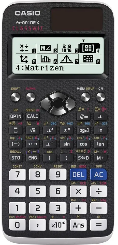 Kategorie: Taschenrechner - DynaTech - GTIN:4250952529067 - Wissenschaftlicher Rechner mit natürlichem Display, d.h. Brüche, Quadratwurzeln und andere mathematische Ausdrücke werden wie im Schulbuch angezeigt Hochauflösendes LC Display mit 193 x 63 Bildpunkten mit viermal so hoher Auflösung wie die bekannten Displays der FX-DE Plus-Serie Der Rechner FX-991DEX ist mit 696 Funktionen das leistungsstärkste Modell der technisch-wissenschaftlichen Taschenrechner Die Speicherkapazität wurde vervierfacht und ermöglicht umfangreiche statistische Berechnungen mit einer vierfach schnelleren Prozessorleistung Die QR-Code-Funktion ermöglicht die Ergebnis-Visualisierung auf dem Smartphone oder Tablet Sprache der Software: Deutsch - 36,99 Euro bei Amazon Marketplace CE - gefunden von billiger.de Dieses "Smart Set" von Kaufland.de bietet den Rechner mit Schutztasche und Fachbuch, was es zu einem umfassenden Paket macht. ![]() ![]() Casio fx-991DE X inkl. Schutztasche Schwarz & Fachbuch (128 Seiten, DIN A5) Wissenschaftlicher Rechner Smart Set - Schwarz