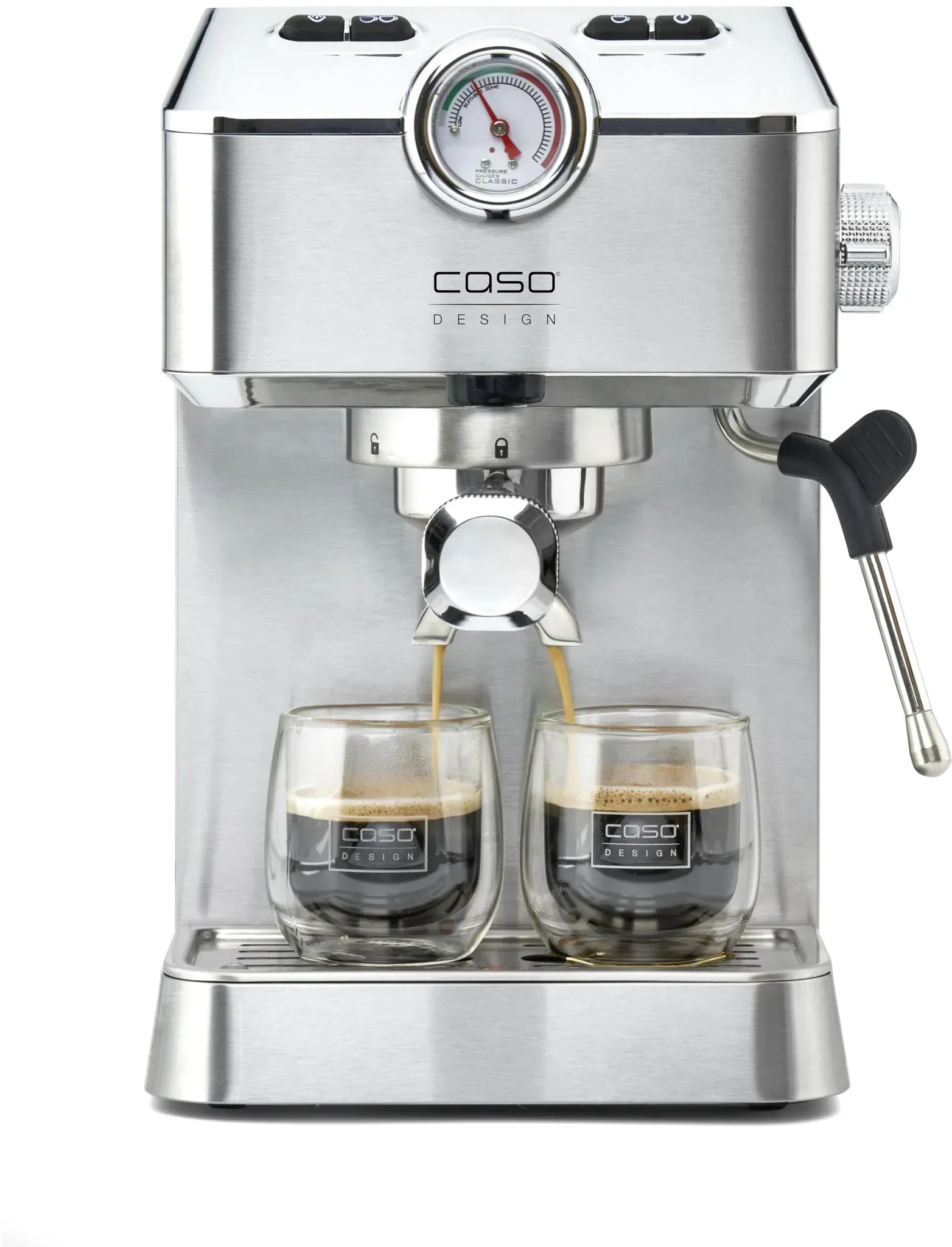 Auf Lager Versand durch AmazonCaso Espresso Gourmet - Siebträgermaschine aus Edelstahl, leistungsstarke 19 bar Ulka-Pumpe, mit Milchaufschäumer, für Kaffeepulver oder ESE Kaffeepads, für 2 Tassen, mit Tassewärmeplatte