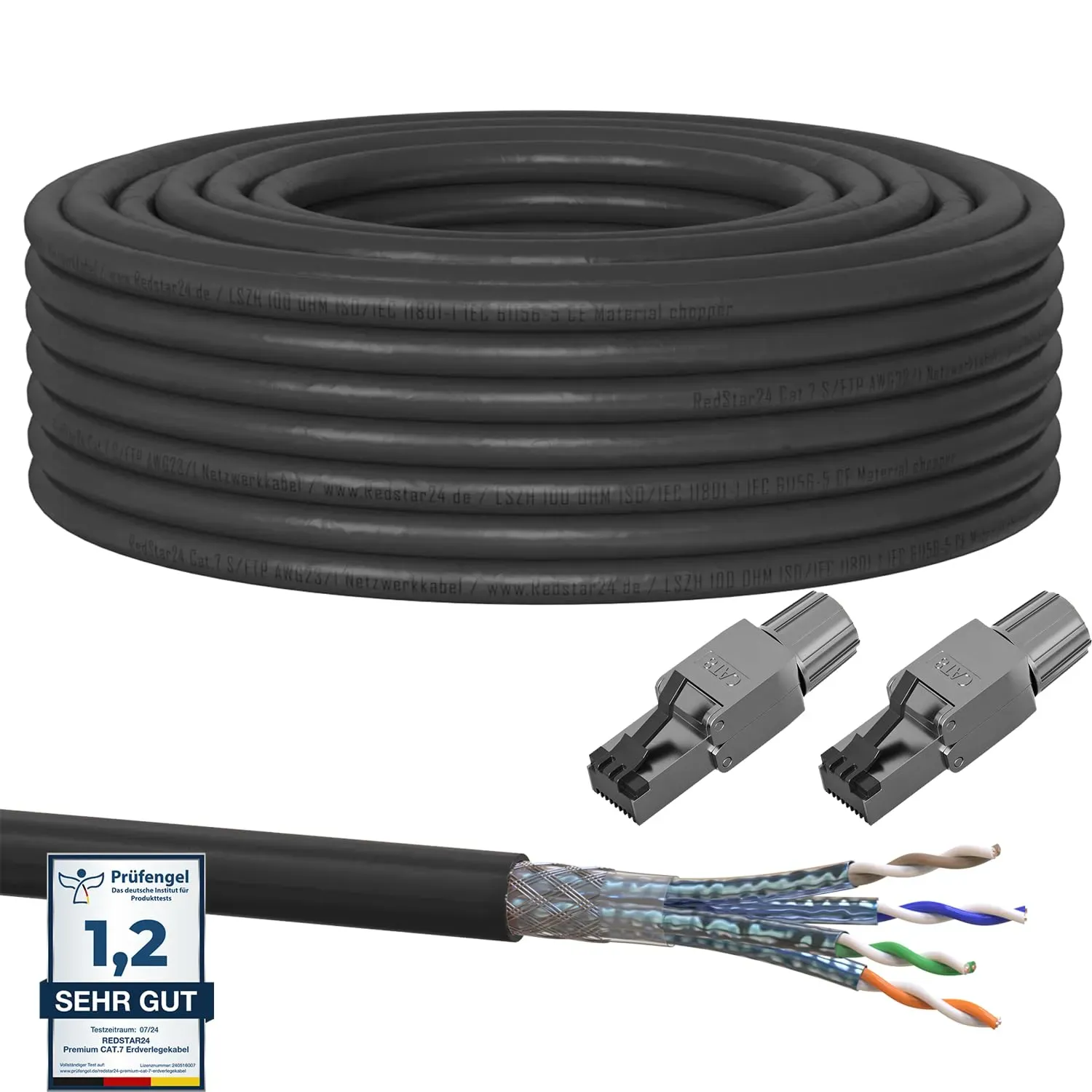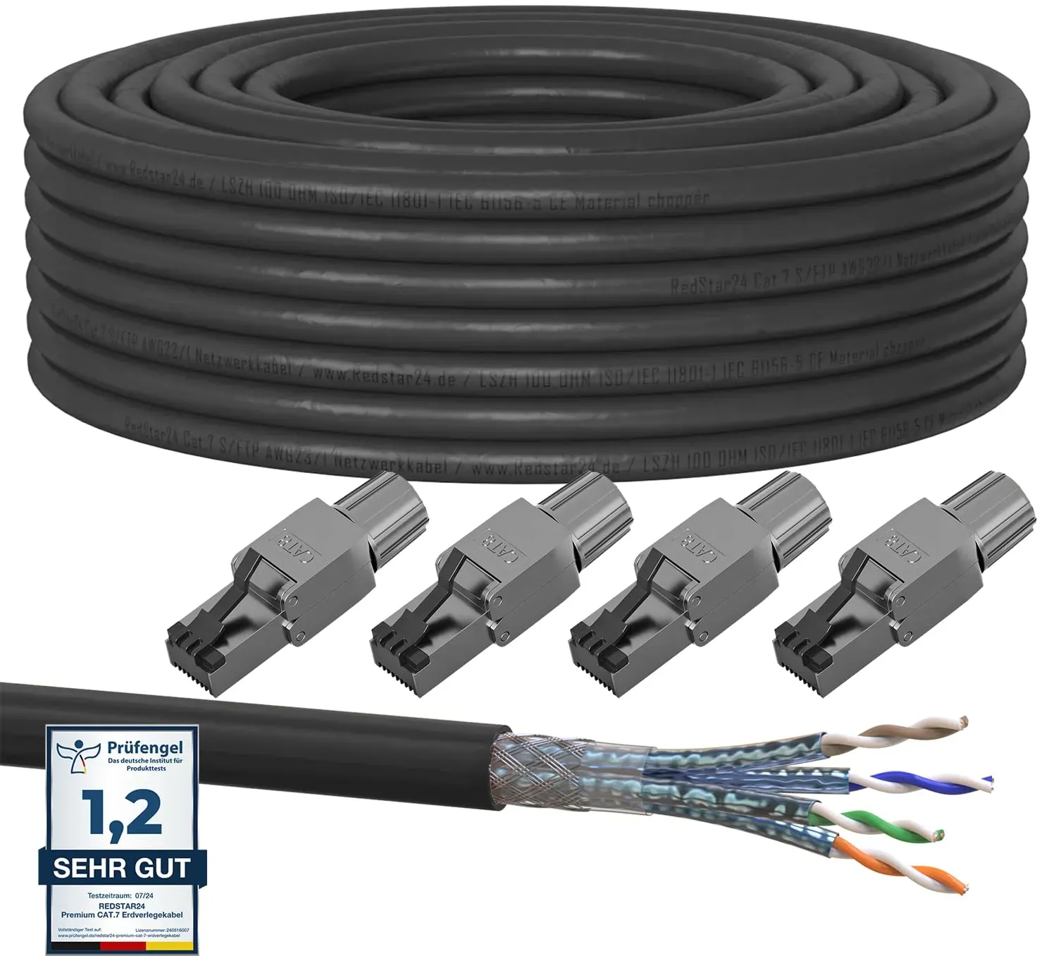 Kategorie: Sonstige Elektroinstallationsartikel - RedStar24 - GTIN:4262390153087 - Robuste Außeneinsatz-Konstruktion: Speziell für den Außeneinsatz konzipiertes CAT 7 Verlegekabel, UV-beständig und feuchtigkeitsgeschützt. Ideal für Verlegungen im Erdreich oder andere anspruchsvolle Umgebungen, bietet dieses Kabel eine langlebige und sichere Verbindung. Hochleistungsdatenübertragung: Profitieren Sie von ultraschnellen Datenübertragungsraten bis zu 10 Gbit/s und einer beeindruckenden Bandbreite von 1000 MHz. Perfekt für Power over Ethernet (PoE/PoE+), kompatibel mit den Standards ISO/IEC 11801 und EN 50575:2014 für ein zuverlässiges und stabiles Netzwerk. Premium Kupferqualität & Abschirmung: Gefertigt aus reinem Kupfer mit 8 isolierten Leitern, verdrillt zu 4 Paaren, für optimale übertragungsqualität. Die S/FTP Doppelschirmung (Folienpaarschirm und Geflechtgesamtschirm) sorgt für effektiven Schutz vor Störungen und Interferenzen ideal für anspruchsvolle Netzwerkanwendungen. Hochgeschwindigkeitsübertragungen: Unterstützt blitzschnelle Datenübertragungen mit CAT-7/7a/8-Netzwerkkabeln und bietet Geschwindigkeiten von bis zu 40 Gbit/s bei Frequenzen bis zu 2000 MHz. Perfekt für anspruchsvolle Netzwerkanwendungen und maximale Leistung. Optimierter RJ45-Stecker & einfache Montage: Bietet zuverlässige Datenübertragungsraten von bis zu 40 Gigabit über Ethernet. Die Montage ist einfach dank des Komplettsets mit detaillierter Anleitung (Deutsch & Englisch) und Einfädelhilfe. Der ... ![]() ![]()
