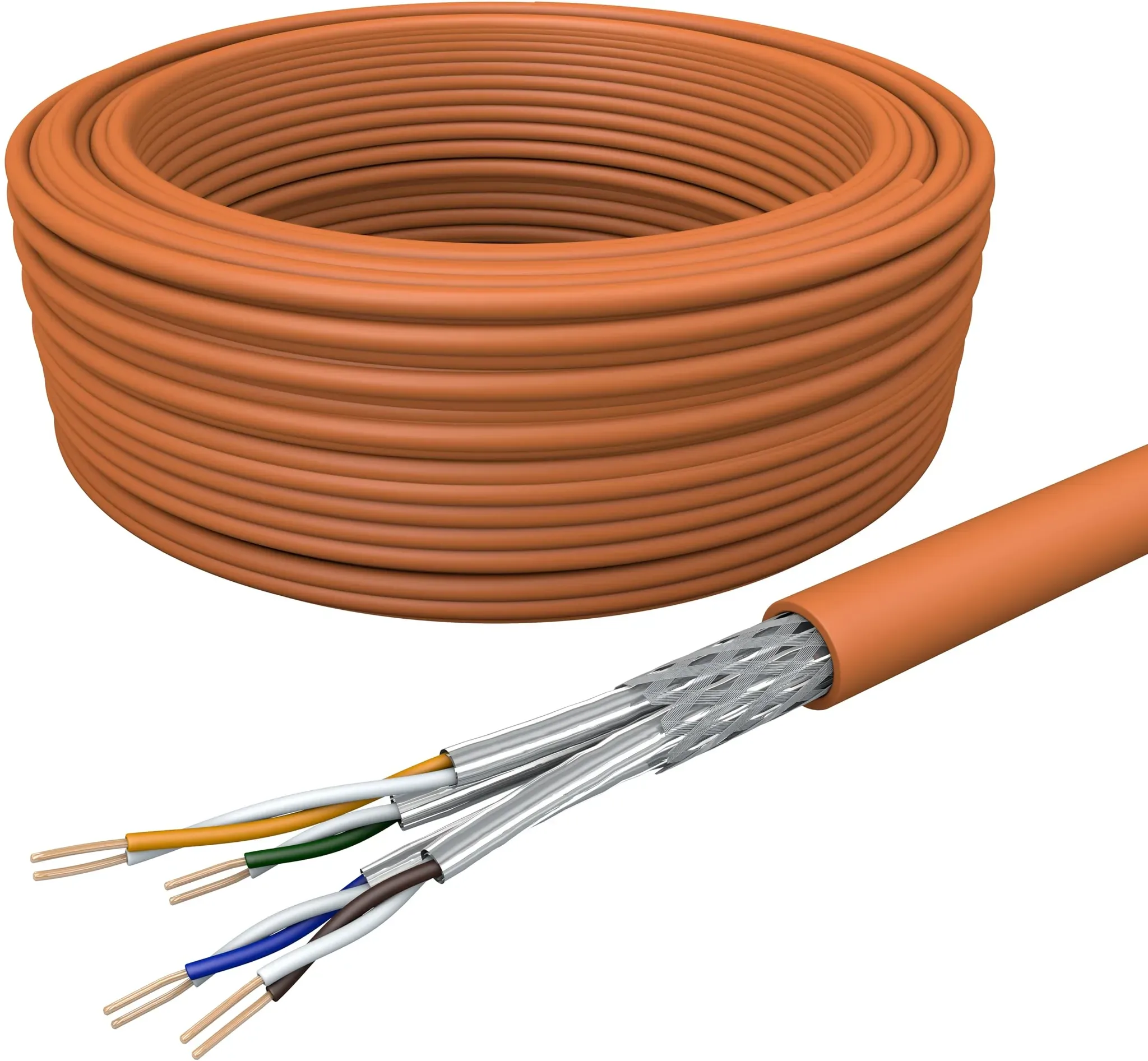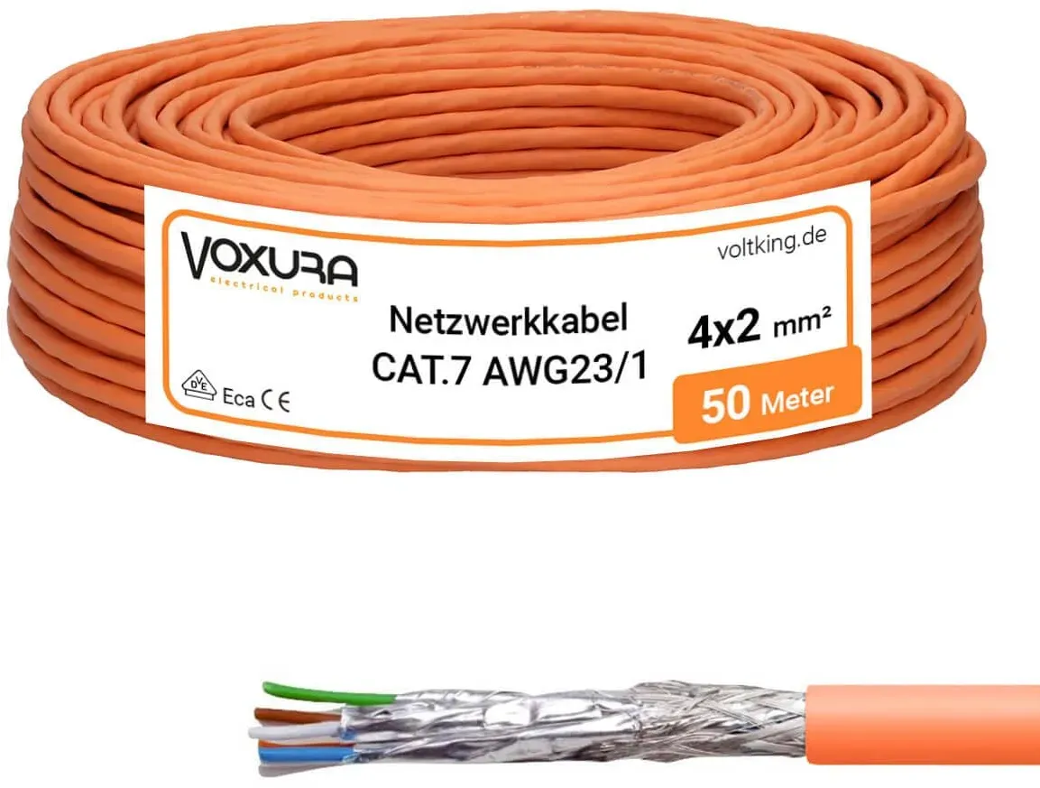Kategorie: Netzwerkkabel - deleyCON - GTIN:4250580145806 - CAT7 Kupfer starres Verlegekabel // S/FTP Doppelt geschirmt PIMF // LSZH Halogenfrei // 1000 MHz // 10 Gbit // AWG 4x2x23/1 ACHTUNG: Starres CAT7 LAN Verlegekabel für LSA Anschlüsse (nicht zum Crimpen) // GHMT Zertifiziert & getestet Kupfer Verlegekabel starr für LSA Anschlüsse: Netzwerkdosen, Patchpanel, Keystone Module etc. Euro Brandklasse: Cca S1 d1 a1 // Erfüllt Bauproduktenverordnung (BauPVo) EN 50575:2014 Innenleiter: Kupfer (CU) // Brandklasse: Cca der BauPVO (nicht mit Innenleiter CCA verwechseln) Farbe: Orange // Länge: 50 Meter // Anzahl: 1 Stück Modellnummer: MK4014 // Marke: deleyCON - 48,99 Euro bei Amazon Marketplace Home Improvement - gefunden von billiger.de Dieses Outdoor-Kabel für 49.90 Euro ist ideal für den Außeneinsatz geeignet, da es PE-ummantelt und AWG23 ist. ![]() ![]() hb-digital CAT7 Verlegekabel Außen 50m Datenkabel S/FTP PE AWG23