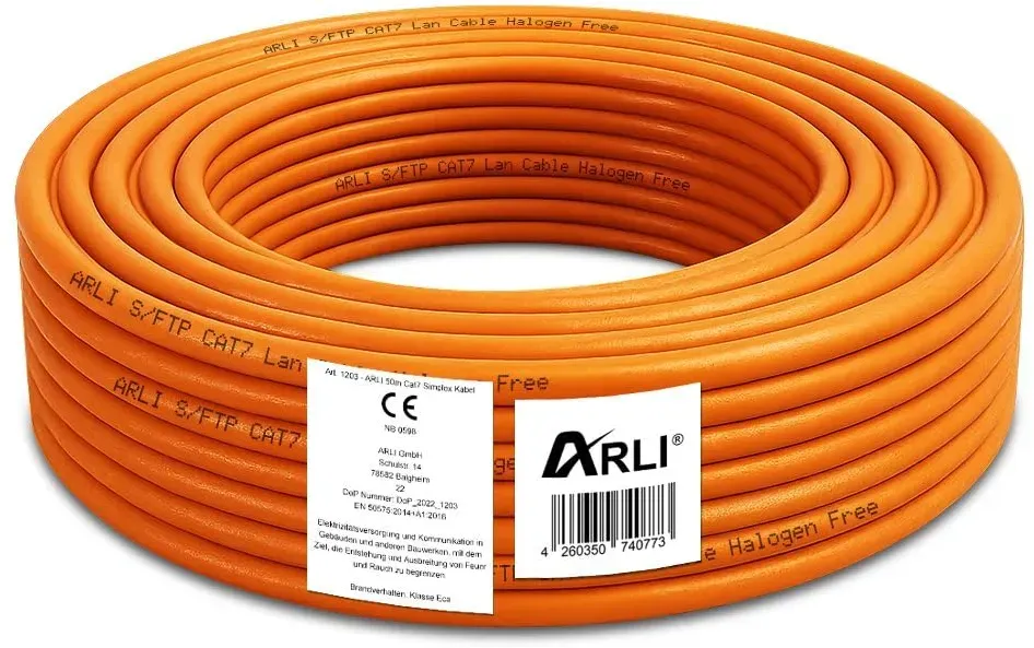 Kategorie: Netzwerkkabel - Arli - GTIN:4260350740773 - Hochwertiges Kupfer Netzwerk / Verlegekabel I CAT7 Verlegekabel Netzwerkkabel Instalationskabel Datenkabel Datenleitung Ethernet Kabel CAT.7 Leiter: Solide blanker Kupferdraht 23AWG/1 I Gesamtzahl der isolierten Leiter: 8 verdrillt zu 4 Paaren I Farbcode: blau-weiss, orange-weiss, grün-weiss, braun-weiss Paarabschirmung: Folienschirmung, bereitstellung von 100% Deckung I Gesamtschirmung: Kupfergeflecht, verzinnt I Aussenmantel: Halogenfrei I Farbe: Orange I Aussendurchmesser: 7,5 mm I Metermakierung Lieferumfang: ARLI 50 m Cat7 Verlegekabel - 33,19 Euro bei Amazon Marketplace Automotive - gefunden von billiger.de Mit 36.89 Euro ist dieses Kabel eine preiswerte Option für Standard-Installationen, die eine solide Cat.7 Leistung erfordern. ![]() ![]() HB-Digital CAT 7 Kabel 50m orange
