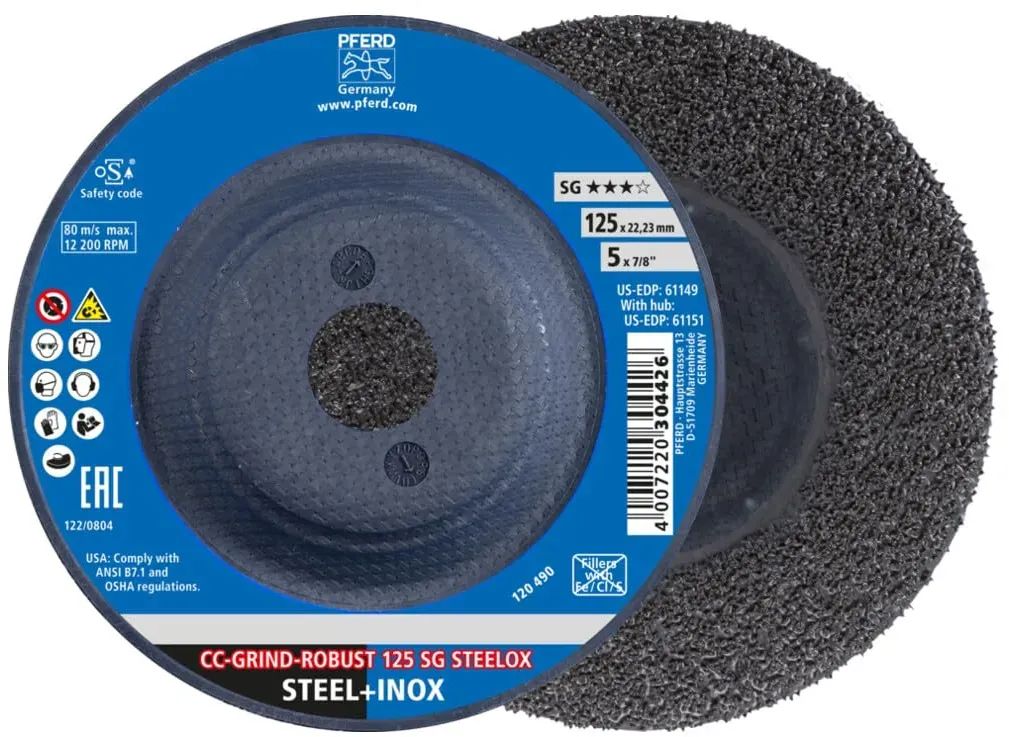 Die CC-GRIND ROBUST verfügt über einen glasfaserverstärkten Kunststofftragteller, der sie besonders stabil und klimaunabhängig macht. Im Vergleich zu Fiberschleifern verformt sie sich nicht und hält extremen Bedingungen stand. Die Scheibe bietet eine extrem hohe Abtragsleistung und eine lange Standzeit - laut Hersteller und Nutzern sogar bis zu viermal so viel wie herkömmliche Schruppscheiben. Die Ausführung SGP STEELOX ist besonders aggressiv und für Stahl/Edelstahl optimiert. Die CC-GRIND ROBUST ist deutlich leichter, leiser und staubärmer als klassische Schruppscheiben. Vibrationen und Lärm werden reduziert, was die Arbeit für den Anwender angenehmer macht. Die Scheibe lässt sich einfach auf handelsüblichen Winkelschleifern montieren und benötigt keinen Sonderspannflansch. Sie eignet sich für Anfasen, Entgraten, Flächenschliff und Schweißnahtbearbeitung. Die Scheibe kann problemlos zurückgesetzt/trimmen werden, aber nur mit einem Anstellwinkel von 45° und vorsichtigem Ansetzen. Beliebte Modelle & Ausführungen