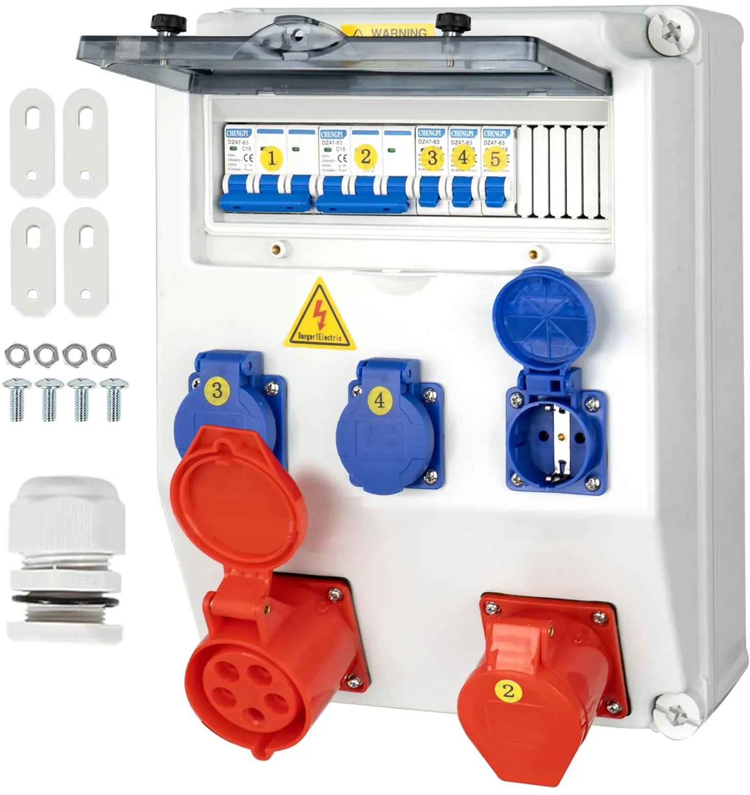 Kategorie: Sonstige Elektroinstallationsartikel - chengpi - GTIN:0612715084499 - - Die wasserdichten IP44-Steckdosenstecker bestehen alle aus massiven Kupfersteckern, die eine ausgezeichnete Leitfähigkeit, einen niedrigen Widerstand haben und weniger anfällig für überhitzung bei hohen Strömen sind, was sie sicherer macht. Stecker mit klappbarer Abdeckung, effektiv wasserdicht. - Die Box besteht aus reinem Polycarbonatmaterial, mit Isolierung, Flammschutzfähigkeit, Korrosionsbeständigkeit, Schlagfestigkeit und hoher und niedriger Temperaturbeständigkeit. - IP65 wasserdichtes/staubdichtes Gehäuse des Baustromverteiler. Der integrierte Silikondichtungsring hat eine starke wasserdichte Leistung und schützt effektiv interne elektrische Komponenten. - Mit dem Baustromverteiler kombinieren Sie clever und sparen dadurch wertvolle Montagezeit. Reservierte Löcher und ordentliche Verkabelung. Drücken Sie die Schnalle fest, ohne zu lösen. Enthält:1*Dreiphasiges Stromzähler 230/400V 5(80)A;3*1P 16A Schaltschalter;1*3P 32A Schaltschalter;3*Europäische Steckdose 16A;1*5-pin CEE Steckdose 16A. - 102,99 Euro bei Amazon Marketplace CE - gefunden von billiger.de Dieser CHENGPI Baustromverteiler ist eine robuste und wasserdichte Lösung mit integriertem Leitungsschutzschalter für anspruchsvolle Umgebungen. ![]() ![]() CHENGPI Baustromverteiler,IP65 Wasserdicht Stromverteiler mit Leitungsschutzschalter, Wandverteiler mit IP54 230V/16A Schuko Steckdose und 380V/32A CEE Steckdose,Starkstrom Verteiler,Socket Box
