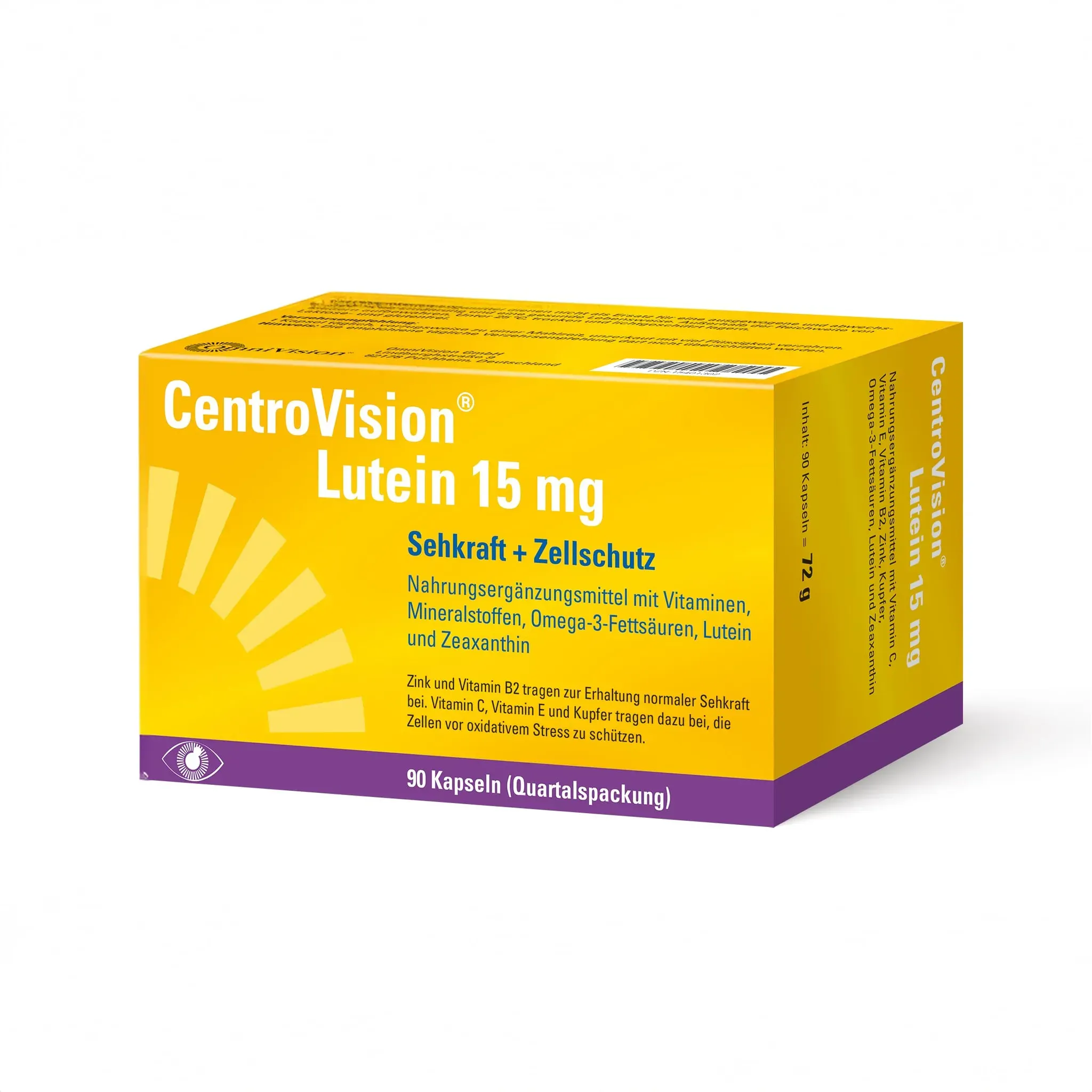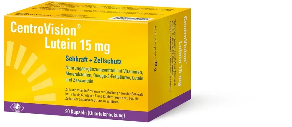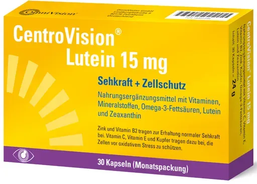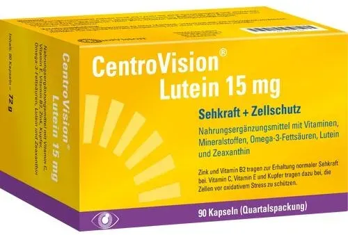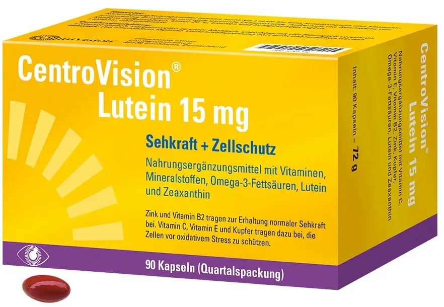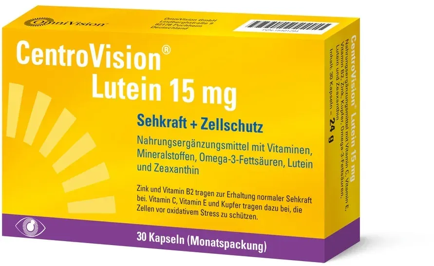 Verfügbarkeit: Auf Lager - Kategorie: Nahrungsergänzungsmittel - OmniVision - GTIN:4150154013022 - ZUR ERHALTUNG DER NORMALEN SEHKRAFT: CentroVision Lutein 15 mg dient zur Erhaltung der normalen Sehkraft und zum Schutz der Zellen vor oxidativem Stress. - 25,80 Euro bei Amazon Marketplace Health & Personal Care - gefunden von billiger.de DocMorris Apotheke hat 90 Kapseln für 27.26 Euro im Sortiment, eine zuverlässige Option für den regelmäßigen Gebrauch. ![]() ![]() OmniVision CentroVision Lutein 15 mg 90 St