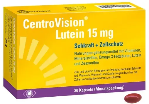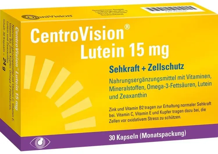 24 Händlerangebote bei billiger.de - Kategorie: Nahrungsergänzungsmittel - OmniVision - Anwendungsgebiet von Centrovision Lutein 15 mg Kapseln (Packungsgröße: 30 stk)Centrovision Lutein 15 mg Kapseln (Packungsgröße: 30 stk) ist ein Nahrungsergänzungsmittel mit Vitamin C, Vitamin E, Riboflavin, Zink, Kupfer, Omega-3-Fettsäuren, Lutein und Zeaxanthin Tagesempfehlung 1x täglich Zum Schlucken angenehme Kapselgröße Ergänzend zu einer gesunden, abwechslungsreichen Ernährung Enthält jetzt 1 mg mehr freies Lutein (aus der Tagetesblüte) Enthält Vitamin B2 zur Erhaltung der normalen Sehkraft Enthält Vitamin E pflanzlichen Ursprungs Laktose- und glutenfrei Nährstoffe €“ zur Erhaltung der Sehkraft Die Zusammensetzung von CentroVision® Lutein 15 mg wurde aus ernährungswissenschaftlichen Gesichtspunkten sorgfältig aufeinander abgestimmt und bietet eine wertvolle Unterstützung in der Ergänzung von spezifischen Nährstoffen, die zur Sehkraft und zum Schutz der Zellen vor oxidativem Stress beitragen. Riboflavin und Zink tragen zur Erhaltung der Sehkraft bei. Docosahexaensäure (DHA) €“ Bestandteil der Omega-3-Fettsäuren €“ trägt ebenfalls zur Erhaltung der Sehkraft bei. Dieser positive Effekt tritt bei einer täglichen Zufuhr von 250 mg DHA ein. Die Einnahme von CentroVision® Lutein 15 mg €“ zusammen mit einer ausgewogenen Ernährung €“ hilft, diese Menge zu erreichen. Die Makula €“ der gelbe Fleck Die Makula ist als kleiner gelber Fleck (lateinisch: ... Apotal bietet hier 30 Kapseln für 9.98 Euro an, was ebenfalls ein sehr guter Einstiegspreis ist. ![]() ![]() OmniVision CENTROVISION Lutein 15 mg Kapseln 30 St