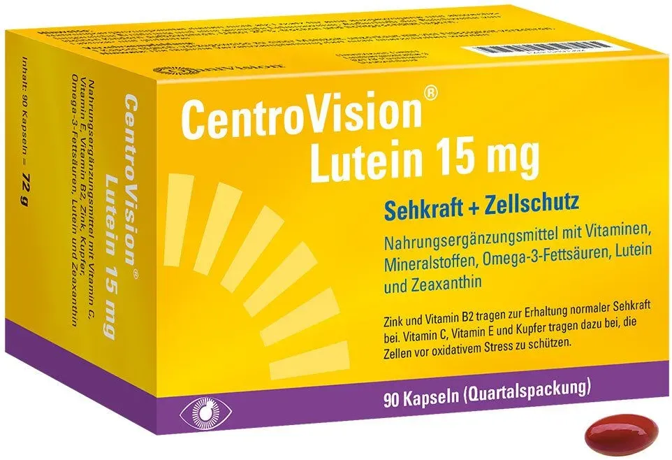 Verfügbarkeit: 1-2 Werktage, 1-2 Werktage - 0,38 €/Stück - Kategorie: Nahrungsergänzungsmittel - OmniVision - GTIN:4150154012940 - PZN:15401294 - CENTROVISION Lutein 15 mg Kapseln 30 St - 11,53 Euro bei Preisapo - gefunden von billiger.de Dieses Angebot von Amazon Marketplace für 90 Kapseln zu 25.80 Euro ist eine kostengünstige Option für eine größere Packung. ![]() ![]() OmniVision CentroVision Lutein 15 mg €“ Zur Erhaltung der normalen Sehkraft, Nahrungsergänzungsmittel mit Vitamin C, Vitamin E, Vitamin B2, Zink, Kupfer, Omega-3-Fettsäuren, Lutein und Zeaxanthin, 90 St.