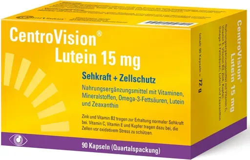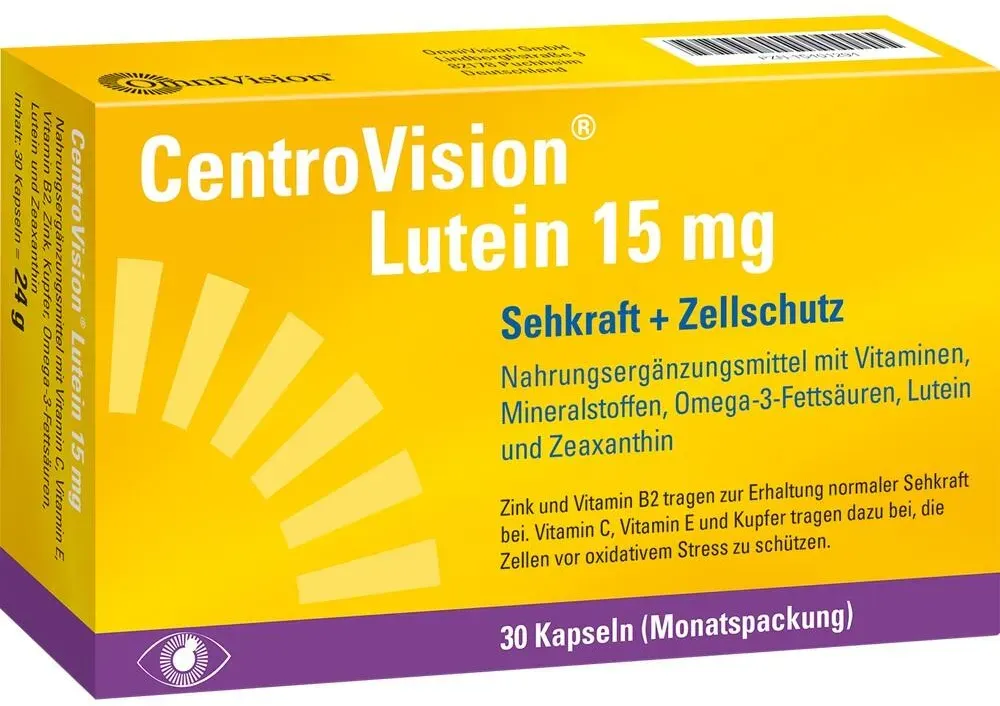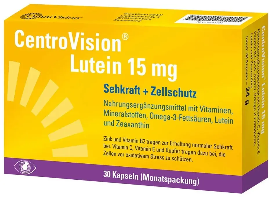 VerfĂĽgbarkeit: Sofort lieferbar - 0,27 € / 1 st - Kategorie: Nahrungsergänzungsmittel - OmniVision - GTIN:9120048760672 - PZN:15401302 - CENTROVISION Lutein 15 mg Kapseln 90 St - 24,37 Euro bei Apotal - gefunden von billiger.de Ein gutes Angebot für 90 Kapseln mit einer umfassenden Nährstoffkombination zur Erhaltung der Sehkraft. ![]() ![]() OmniVision CentroVision Lutein 15 mg €“ Zur Erhaltung der normalen Sehkraft, Nahrungsergänzungsmittel mit Vitamin C, Vitamin E, Vitamin B2, Zink, Kupfer, Omega-3-Fettsäuren, Lutein und Zeaxanthin, 90 St.