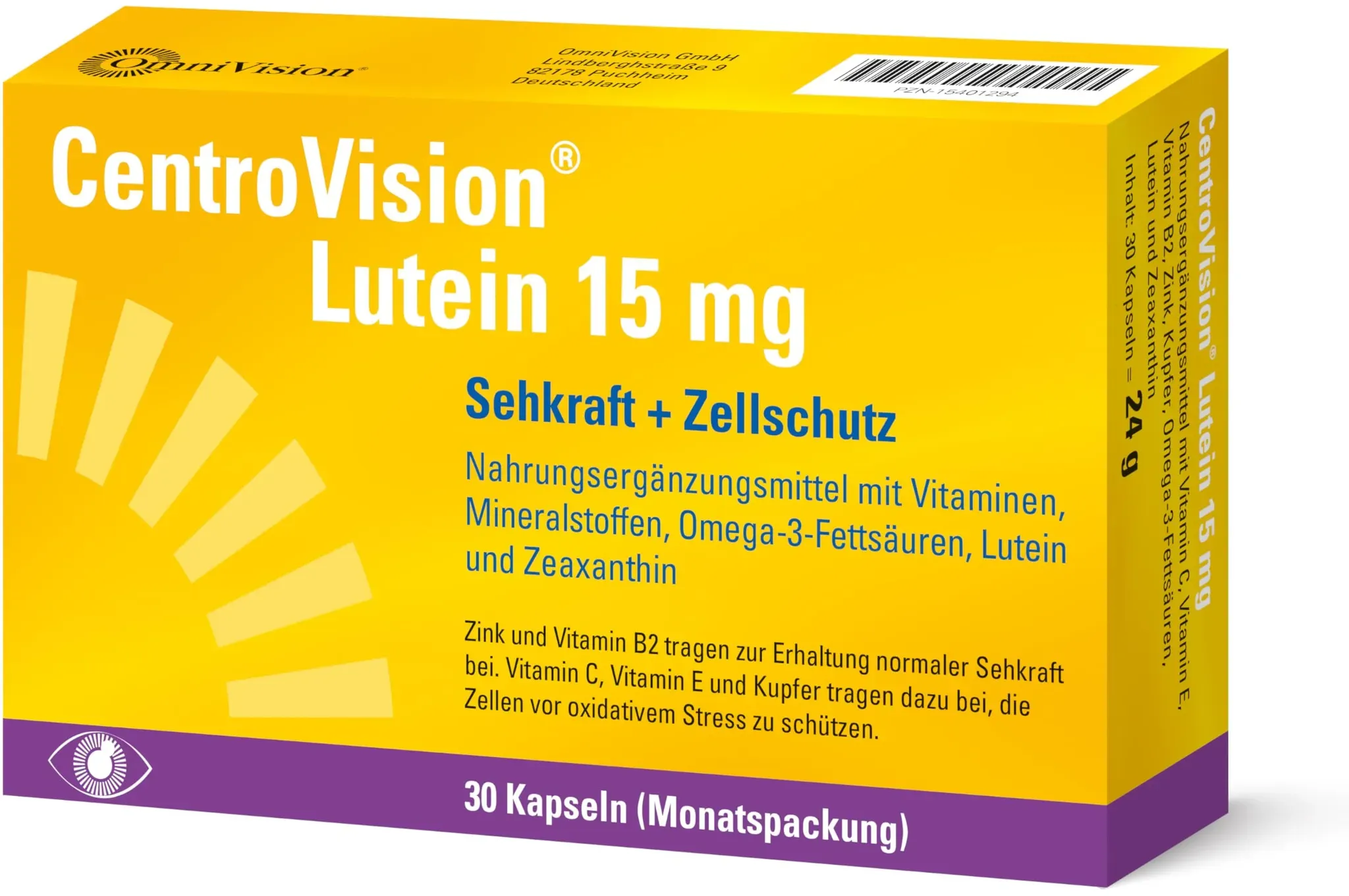 24 Händlerangebote bei billiger.de - Kategorie: Nahrungsergänzungsmittel - OmniVision - Anwendungsgebiet von Centrovision Lutein 15 mg Kapseln (Packungsgröße: 30 stk)Centrovision Lutein 15 mg Kapseln (Packungsgröße: 30 stk) ist ein Nahrungsergänzungsmittel mit Vitamin C, Vitamin E, Riboflavin, Zink, Kupfer, Omega-3-Fettsäuren, Lutein und Zeaxanthin Tagesempfehlung 1x täglich Zum Schlucken angenehme Kapselgröße Ergänzend zu einer gesunden, abwechslungsreichen Ernährung Enthält jetzt 1 mg mehr freies Lutein (aus der TagetesblĂĽte) Enthält Vitamin B2 zur Erhaltung der normalen Sehkraft Enthält Vitamin E pflanzlichen Ursprungs Laktose- und glutenfrei Nährstoffe €“ zur Erhaltung der Sehkraft Die Zusammensetzung von CentroVision® Lutein 15 mg wurde aus ernährungswissenschaftlichen Gesichtspunkten sorgfältig aufeinander abgestimmt und bietet eine wertvolle UnterstĂĽtzung in der Ergänzung von spezifischen Nährstoffen, die zur Sehkraft und zum Schutz der Zellen vor oxidativem Stress beitragen. Riboflavin und Zink tragen zur Erhaltung der Sehkraft bei. Docosahexaensäure (DHA) €“ Bestandteil der Omega-3-Fettsäuren €“ trägt ebenfalls zur Erhaltung der Sehkraft bei. Dieser positive Effekt tritt bei einer täglichen Zufuhr von 250 mg DHA ein. Die Einnahme von CentroVision® Lutein 15 mg €“ zusammen mit einer ausgewogenen Ernährung €“ hilft, diese Menge zu erreichen. Die Makula €“ der gelbe Fleck Die Makula ist als kleiner gelber Fleck (lateinisch: ... Ein preiswertes Angebot für 30 Kapseln, das einen guten Einstieg in die Produktreihe bietet. ![]() ![]() OmniVision CentroVision Lutein 15 mg 30 St