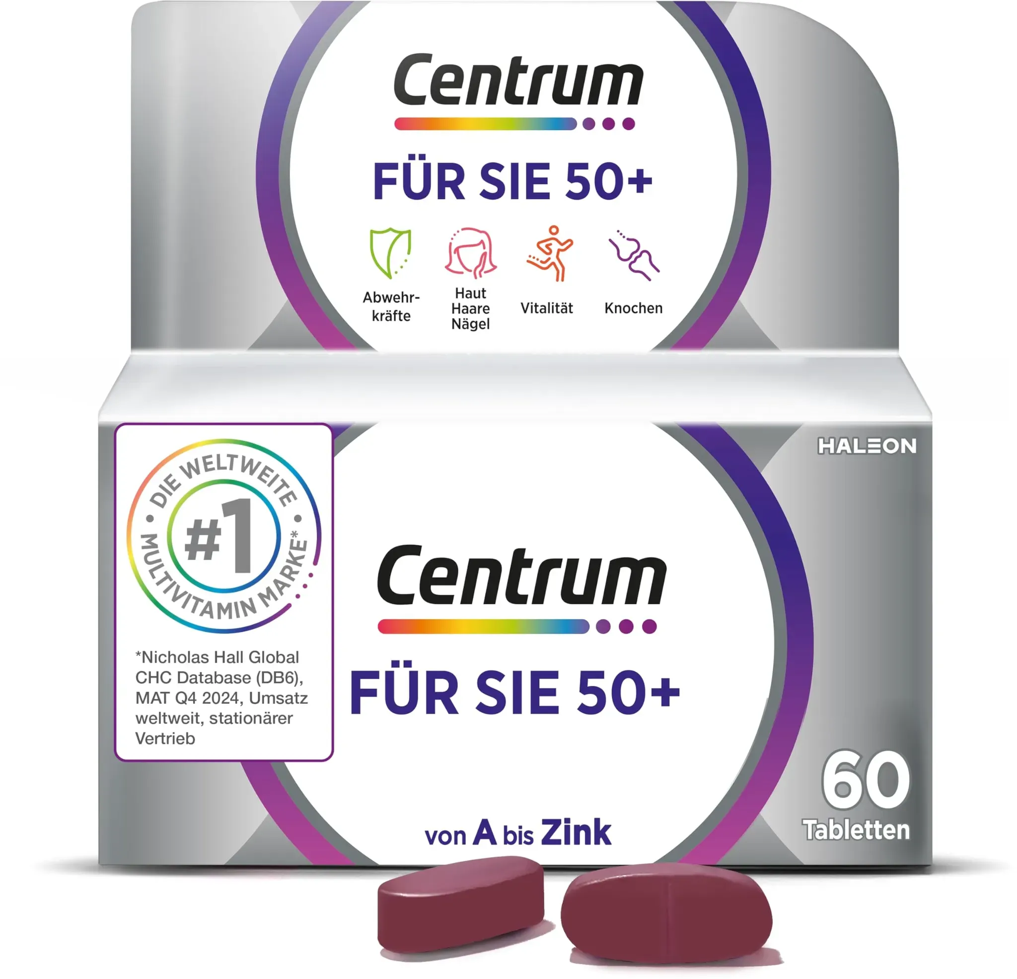 0.61 eur / 1st - 'Wohlbefinden Vitamine & Mineralien','Wohlbefinden Vitamine & Mineralien Multivitaminpräparate','Arzneimittel-Gesundheit Frauengesundheit Vitamine für die Frau' Vitamine & Ergänzungen - EAN:4260639690218 - Centrum für Sie 50+Hochwertige Komplettversorgung mit Mikronährstoffen Speziell für Frauen ab 50 Die Centrum Verpackungen werden derzeit sukzessive auf ein neues Design umgestellt; während der Umstellungszeit sind beide Versionen im Umlauf. Die Tablettenfarbe ist etwas dunkler als zuvor. glutenfrei laktosefreigelatinefreiDer menschliche Körper ist ein biologisches Meisterwerk in dem hochkomplexe Prozesse ablaufen für die Mikronährstoffe in ausreichender Menge benötigt werden. Die Centrum Frauen-Nährstoff-Formel Für Sie 50+ enthält alle lebensnotwendigen Vitamine sowie wichtige Mineralstoffe und Spurenelemente. Die Formulierung ist speziell auf die Bedürfnisse von Frauen ab 50 abgestimmt - zur optimalen Ergänzung Ihrer täglichen Ernährung. Mit nur einer Tablette pro Tag decken Sie den Tagesbedarf vieler Vitamine.Das Ergebnis: Der Körper wird durch die mit Sorgfalt zusammengestellte Nährstoffformel ganzheitlich unterstützt.Abwehrkräfte: Vitamin C, Zink und Selen unterstützen die normale Funktion des Immunsystems.Gehirn: Eisen trägt zu einer normalen kognitiven Funktion und Pantothensäure zu einer normalen geistigen Leistung bei.Augen: Vitamin A trägt zur Erhaltung normaler Sehkraft bei.Vitalität und Energie: Vitamin B6 und B12 tragen zur Verringerung von ... Dieses Angebot ist mit 21.66 Euro eine preiswerte Option für die "Centrum Generation 50+" mit 60 Tabletten. Juvalis.de Centrum Generation 50+
