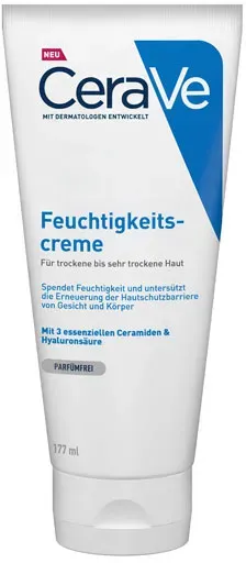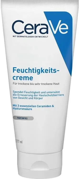 59,83 /l - Kategorie: Ganzkörperpflege - CeraVe - GTIN:3337875598996 - PZN:14017607 - Erneuert den natürlichen Hautschutz mit 3 essenziellen Ceramiden Langanhaltende Feuchtigkeit dank patentierter Wirkstoff-Freisetzung Dermatologisch bewiesene Wirksamkeit. Ceramide und Hyaluron unterstützen die Erneuerung der Hautschutzbarriere und machen selbst trockene und raue Haut samtig zart. Langanhaltend und tiefenwirksam. Die in CeraVe enthaltene patentierte Retard-Technologie setzt Ceramide und Hyaluron im Laufe der Zeit frei und lässt sie tief in Haut eindringen. Dadurch kann CeraVe seine Wirkung noch lange nach dem Auftragen entfalten. Wunderbar seidige Texturen mit Hyaluron. Die reichhaltige CeraVe Feuchtigkeitscreme enthält Hyaluron. Das gibt der Haut einen zusätzlichen Feuchtigkeitsboost. Das Auftragen von CeraVe ist dank der seidig zarten Texturen besonders angenehm. CeraVe Feuchtigkeitscreme enthält eine Kombination aus drei essenziellen Ceramiden 1, 3 und 6-II, die die Hautschutzbarriere aufbaut und die Haut wieder zart und samtig macht. Die aktiven Wirkstoffe wie Ceramide und Hyaluron werden durch die patentierte Wirkstoff-Freisetzung über den Tag freigesetzt und geben der trockenen Haut ihr Wohlbefinden zurück. CeraVe Feuchtigkeitscreme ist für Kinder und Erwachsene geeignet. Die Verträglichkeit ist von Dermatologen bestätigt und mit dem Ecarf-Qualitätssiegel als allergikerfreundlich ausgezeichnet. Wunderbar seidige Textur mit Hyaluron CeraVe Feuchtigkeitscreme enthält ... Ein zuverlässiges Angebot für die CeraVe Feuchtigkeitscreme von Preisapo. ![]() ![]() CeraVe Feuchtigkeitscreme für Gesicht und Körper 177 ml
