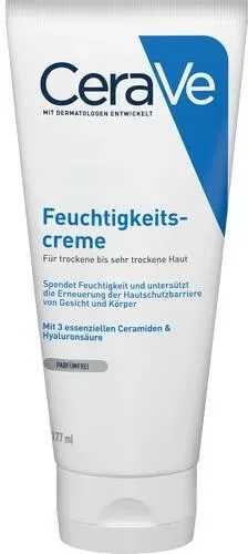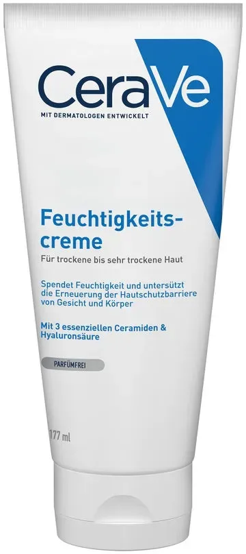 EAN: 3337875598996 - Erneuert den natürlichen Hautschutz mit 3 essenziellen Ceramiden Langanhaltende Feuchtigkeit dank patentierter Wirkstoff-Freisetzung ? Dermatologisch bewiesene Wirksamkeit. Ceramide und Hyaluron unterstützen die Erneuerung der Hautschutzbarriere und machen selbst trockene und raue Haut samtig zart. ? Langanhaltend und tiefenwirksam. Die in CeraVe enthaltene patentierte Retard-Technologie setzt Ceramide und Hyaluron im Laufe der Zeit frei und lässt sie tief in Haut eindringen. Dadurch kann CeraVe seine Wirkung noch lange nach dem Auftragen entfalten. ? Wunderbar seidige Texturen mit Hyaluron. Die reichhaltige CeraVe Feuchtigkeitscreme enthält Hyaluron. Das gibt der Haut einen zusätzlichen Feuchtigkeitsboost. Das Auftragen von CeraVe ist dank der seidig zarten Texturen besonders angenehm. CeraVe Feuchtigkeitscreme enthält eine Kombination aus drei essenziellen Ceramiden 1, 3 und 6-II, die die Hautschutzbarriere aufbaut und die Haut wieder zart und samtig macht. Die aktiven Wirkstoffe wie Ceramide und Hyaluron werden durch die patentierte Wirkstoff-Freisetzung über den Tag freigesetzt und geben der trockenen Haut ihr Wohlbefinden zurück. CeraVe Feuchtigkeitscreme ist für Kinder und Erwachsene geeignet. Die Verträglichkeit ist von Dermatologen bestätigt und mit dem Ecarf-Qualitätssiegel als allergikerfreundlich ausgezeichnet. Wunderbar seidige Textur mit Hyaluron CeraVe Feuchtigkeitscreme enthält Hyaluron. Diese gibt der trockenen Haut den zusätzlichen ... Ein sehr preiswertes Angebot für die CeraVe Feuchtigkeitscreme, das eine gute Option für den Einstieg darstellt. ![]() ![]() CeraVe Feuchtigkeitscreme 177 ml