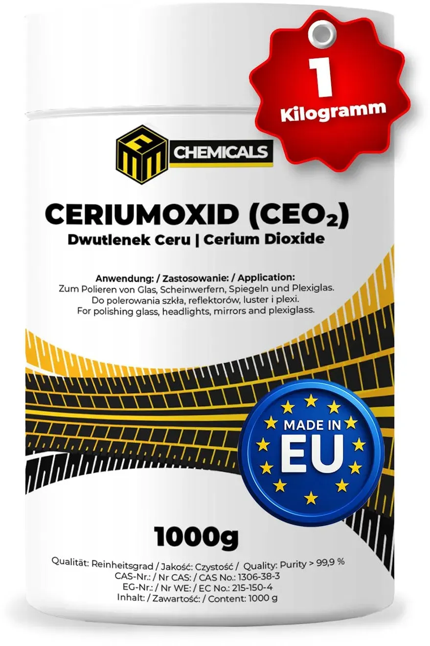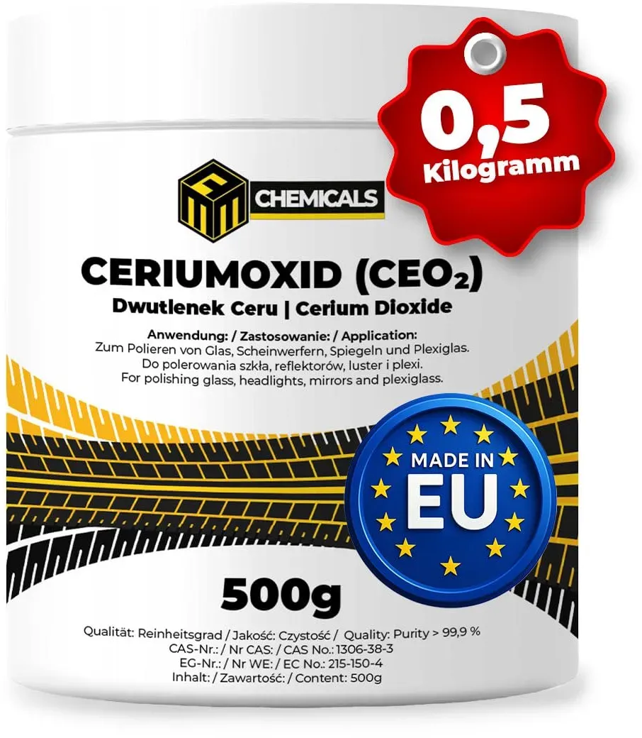 36,00 /l - Kategorie: Reinigungsmittel - pure chemical - GTIN:5901138048566 - Ceriumoxid zum Polieren von Glas 100g Ceriumoxid ist eine chemische Substanz, die in der Glasindustrie und Automobilbranche unverzichtbar ist. Es wird auch im Bauwesen und in der Renovierungsbranche zum Polieren von Glas verwendet.Produktbezeichnung:Produktname: CeriumoxidWeitere Namen: Dioxid Cerium, Ceriumoxid (IV), Cerium (IV) OxidChemische Formel:CAS-Nr: 1306-38-3EG-Nr: 215-150-4Zusammensetzung: 100% Ceriumoxid (ohne Zusätze)Charakteristik: PulverQualität: Reine Qualität ohne ZusätzeVerpackung: 100g nettoIdeal geeignet zum Entfernen von Kratzern auf Autoscheiben, Scheinwerfern, Spiegeln, Linsen oder Uhrengläsern. Vorschlag zur Anwendung von Ceriumoxid:Bereiten Sie die zu polierende Oberfläche vor, indem Sie sie gründlich reinigen und von allen Partikeln befreien, die die polierte Fläche zerkratzen könnten. Wenn Sie eine Autoscheibe oder einen Scheinwerfer polieren, schützen Sie den Lack um das zu polierende Element mit Malerklebeband. Bereiten Sie das Poliermilchgemisch vor, indem Sie Ceriumoxid mit Wasser im Verhältnis von 70 ml Wasser auf 100 g Ceriumoxid anmischen. Mischen Sie die Lösung gut durch. Verwenden Sie zum Polieren Filzwalzen mit einer maximalen Drehzahl von 500-700 U/min. Tragen Sie die Poliermilch auf den Filz auf und verteilen Sie sie auf der zu polierenden Oberfläche. Polieren Sie die Kratzer und die angrenzende Fläche mit langsamen, kreisförmigen Bewegungen. Achten Sie ... Mit 6.51 Euro ist dieses 100g Tiefenkratzer-Entferner-Set ein sehr günstiges Angebot für eine größere Menge Ceroxid-Pulver. ![]() ![]() œ¿100 g - Tiefenkratzer Entferner, eBay Reparatur Glas Polierset, Pulver Ceroxid—