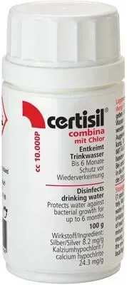 Beliebte Merkmale, Marken und ModelleCertisil Combina (Marke: Katadyn) ist speziell für Wasserdesinfektion mit Chlor + Silberionen beliebt, da es schnell wirkt (30 Min.), lang schützt (6 Monate) und für Tanks bis 10.000 Liter taugt - besonders bei mikrobiologisch unsicherem Wasser aus Brunnen/Quellen in Süd-/Osteuropa oder Tropen.[1][3][5][7][9]