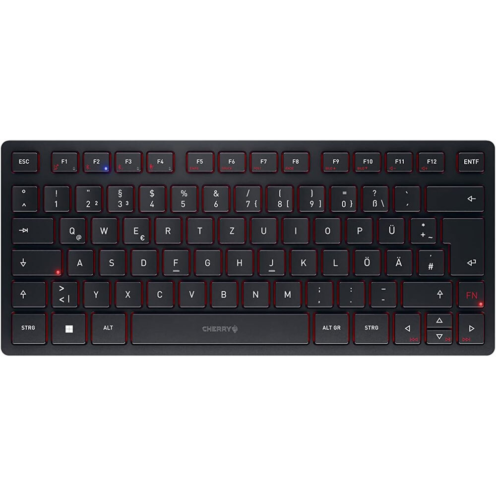 33 Händlerangebote bei billiger.de - Kategorie: Tastaturen - Cherry - Kabellose Multi-Device-Tastatur mit 4 übertragungskanälen für bis zur 4 Endgeräte: Zwei Bluetooth-Kanäle, ein 2,4 GHz Funk- und ein Kabelkanal (LEDs zeigen gewählte Verbindung an) Kompakt und praktisch: Die flache Mini-Tastatur ohne Nummernblock eignet sich ideal für mobiles Arbeiten und häufige Arbeitsplatzwechsel (inkl. Transporttasche aus recyceltem Kunststoff) Wiederaufladbar: Abnehmbares USB-A auf USB-C Kabel für Datenübertragung sowie Ladevorgang (Keyboard ist auch während des Betriebs aufladbar, Akku hält mehrere Wochen) Präzise CHERRY SX-Scherenmechanik: Flache Tasten sowie besonders angenehmes und geräuscharmes Tippen sorgen für ein ideales Betätigungsgefühl und hohen Schreibkomfort ästhetisches Statement: Minimalistisches Design mit rot hinterlegten Tasten* macht die Minitastatur zum Hingucker in jedem Arbeitsumfeld (* Tastatur ist nicht hintergrundbeleuchtet) - GTIN:4025112099809 ![]() ![]() CHERRY KW 9200 MINI, Kompakte Multi-Device-Tastatur für bis zu 4 Geräte, Französisches Layout (AZERTY), Bluetooth, 2,4 GHz oder Kabel, Wiederaufladbar, Schwarz