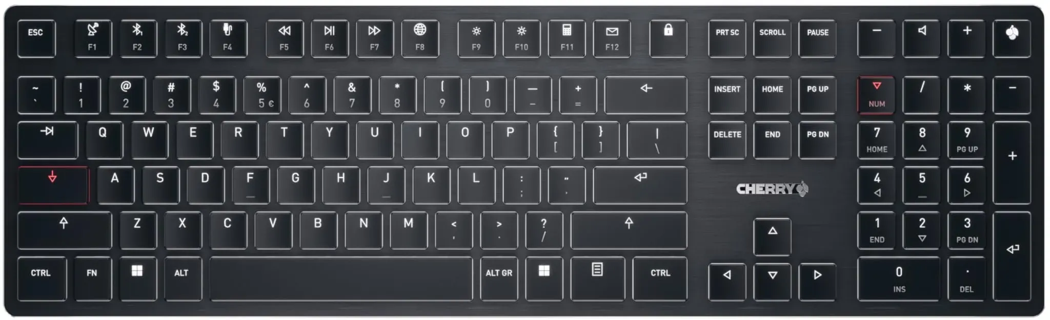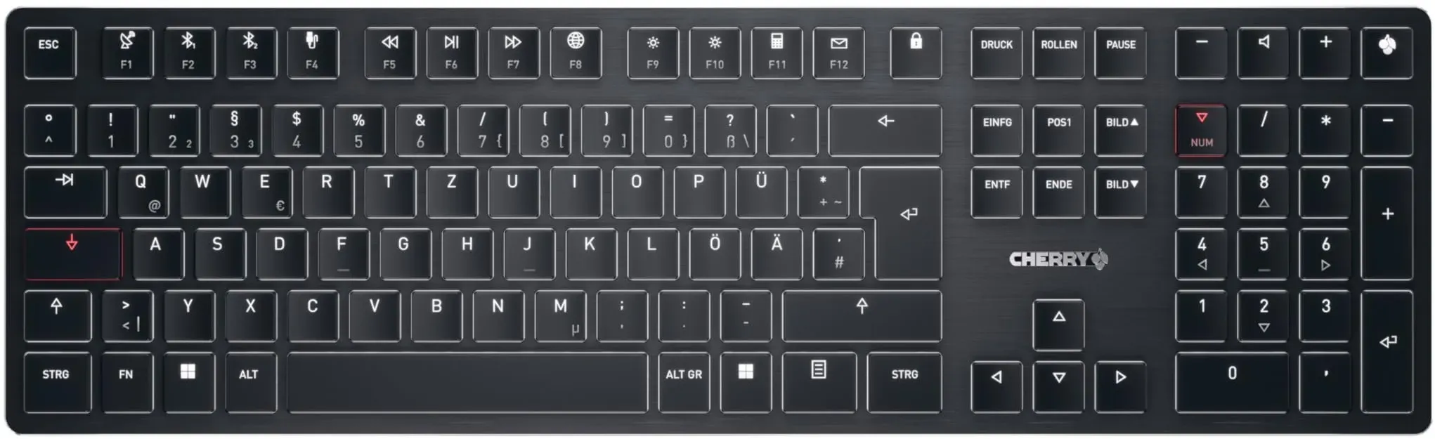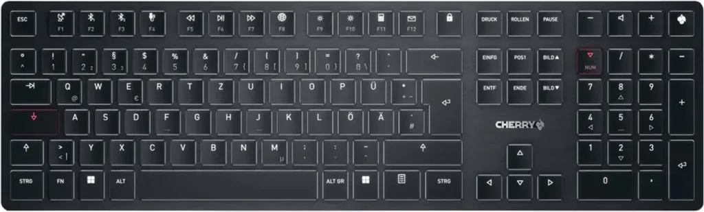 28 Händlerangebote bei billiger.de - Kategorie: Tastaturen - Cherry - Ultra-flache mechanische Tastatur: So ästhetisch und schlank wie Slim-Tastaturen und doch mechanisch, präzise und robust - geeignet für Vielschreiber, Programmierer, im Büro sowie für Gaming Multi-Device-Tastatur für bis zu 4 verschiedene Geräte: Zwei Bluetooth 5.2 Channels, ein 2.4 GHz Wireless Channel (jeweils mit sicherer AES-128 Verschlüsselung) und ein Kabelkanal CHERRY MX ULTRA LOW PROFILE Switches: Exklusiv in Deutschland hergestellte Schalter, bis zu 50 Mio. Tastenbetätigungen, absolute Präzision und ein unvergleichliches Tippgefühl Tastenbeleuchtung: Geschmackvolle weiße Beleuchtung der Tasten und zusätzliche farbige LEDs für Status- und Sondertasten (+ RGB-LED in der CHERRY Taste für die Anzeige des Ladestands) Wiederaufladbar: Abnehmbares USB-A auf USB-C Kabel zum Aufladen und für den Betrieb im kabelgebundenen Modus (Keyboard ist problemlos auch während des Betriebs aufladbar) - GTIN:4025112098680 Diese Tastatur bietet ein gutes Preis-Leistungs-Verhältnis für ein hintergrundbeleuchtetes Modell. ![]() ![]() Cherry KW X ULP - Tastatur - hintergrundbeleuchtet - Schwarz