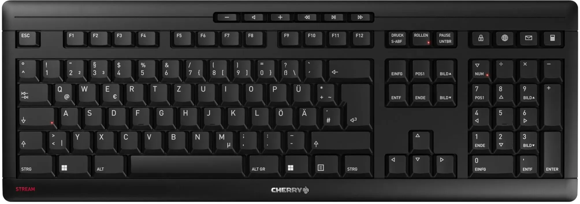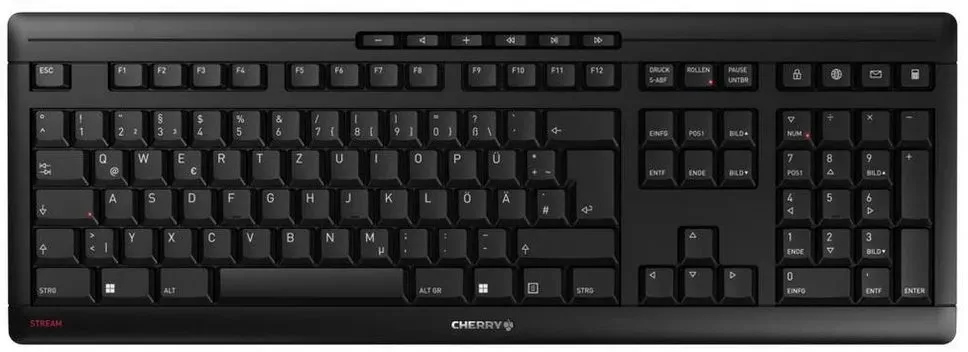 Kategorie: Tastaturen - Cherry - GTIN:4025112096969 - Hochwertige Funktastatur mit Nummernblock: Kabellos, zuverlässig und flüsterleise - ausgezeichnet mit dem Umweltzeichen Blauer Engel sowie dem GS-Siegel Geprüfte Sicherheit Plug & Play: Einfach per USB-Dongle über 2,4 GHz Funk verbinden und das Keyboard funktioniert ohne Kabel innerhalb einer Reichweite von 10 Metern (mit sicherer AES-128 Verschlüsselung) Schneller tippen und mehr schaffen: CHERRY SX-Scherentechnologie sorgt für einen präzisen Druckpunkt und ein optimales Schreibgefühl auf flachen Tasten. Perfekt für Vielschreiber Rutschfest und stabil: 2 Ausklappfüße zur Höhenverstellung, 8 Gummifüße sowie eine integrierte Metallplatte verleihen der flachen Tastatur Stabilität und verhindern, dass irgendetwas verrutscht Praktisch: Tastatur verfügt über 10 Zusatztasten sowie integrierte Status-LEDs für CAPS LOCK-, NUM- und SCROLL-Taste, die niedrigen Batteriestand anzeigen (Batterielaufzeit bis zu 36 Monate) - 53,08 Euro bei Amazon Marketplace PC Notebook - gefunden von billiger.de Ein beliebtes Modell mit deutschem Layout, 2,4 GHz Funk und leisem Tastenanschlag. ![]() ![]() CHERRY STREAM KEYBOARD WIRELESS, Kabellose Tastatur, Deutsches Layout (QWERTZ), 2,4 GHz Funk, Leise Tasten, Flaches Design, Batteriebetrieben, Schwarz
