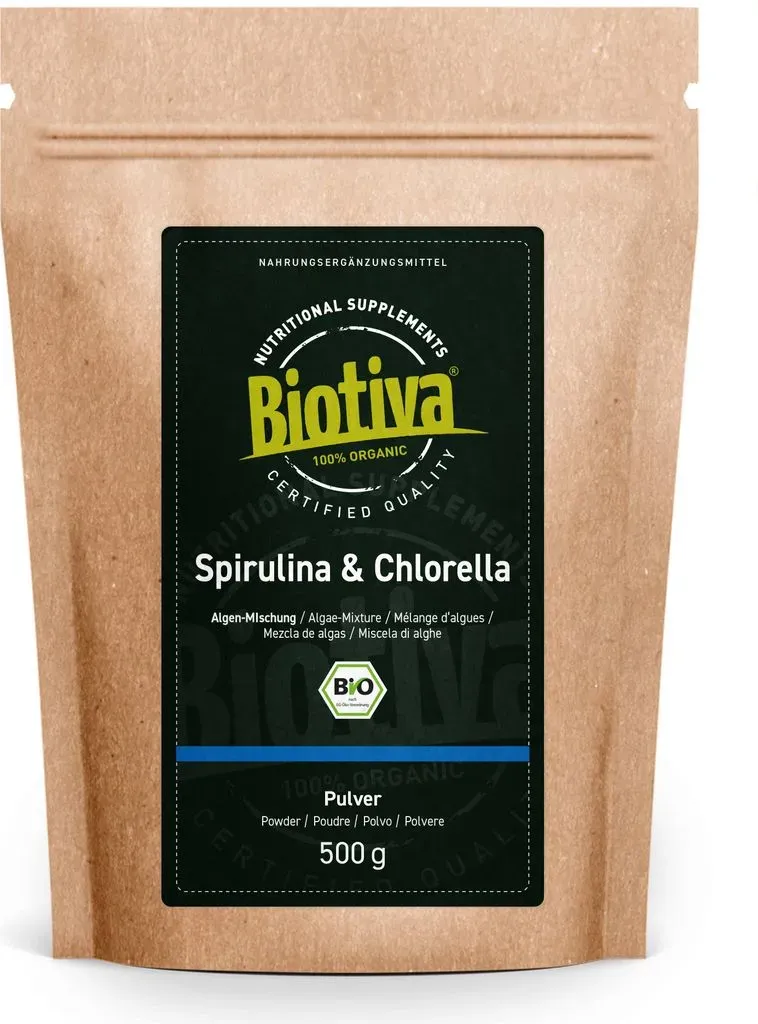 Auf Lager Versand durch Amazon500g BIO Spirulina & Chlorella Pulver, 100% natürlich, rückstandskontrolliert, nach EU-ÖKO-Standard kultiviert und hergestellt, Rohkostqualität, ohne Zusätze (500g)