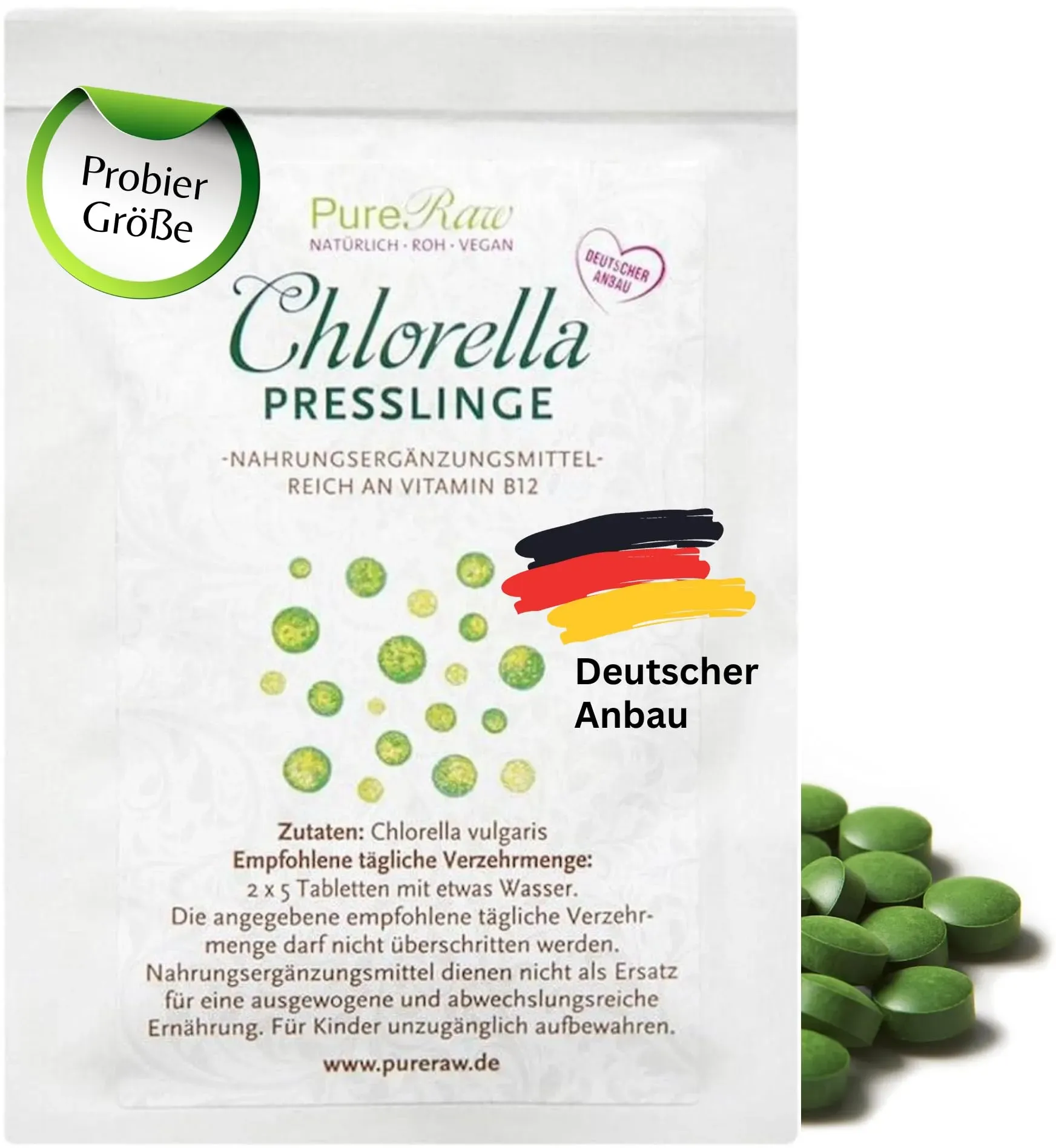 Verfügbarkeit: Auf Lager - Kategorie: Nahrungsergänzungsmittel - PureRaw - GTIN:4260345591564 - ð HOCHWERTIGE MIKRO-ALGE: 100% reine Chlorella-Algen, getrocknet, ohne Zusätze, in außergewöhnlicher Qualität. Der frische, aromatische Duft, der dezent grasige, mild-nussige Geschmack und die intensive grüne Farbe sprechen für sich! Keine unangenehm fischige, muffige oder künstliche Note. Nur beste, reine Grünalge für Genuss und Wohlbefinden. Einfach zu verwenden, z.B. flüssig einnehmen im Grünen Smoothie, Drink, Bowl, Joghurt, Saftkur, zur Grün-Färbung von Desserts oder in Naturkosmetik. NäHRSTOFFREICH INKL. VITAMIN B12: Das getrocknete Algen-Pulver ist reich an bioverfügbaren Vitalstoffen wie Mineralien, Spurenelemente, Aminosäuren, insbesondere Chlorophyll, Eisen und - durch die besondere Art des Anbaus - sogar natürliches Vitamin B12 (Adenosylcobalamin, Methylcobalamin und Spuren von Hydroxocobalamin). Jod ist nur in Spuren vorhanden. Auch Kinder lieben Chlorella als Nahrungsergänzungsmittel für die natürliche Nährstoffversorgung. ð SUPERFOOD AUS DEUTSCHLAND: Anbau im Glasröhrensystem in einem Gewächshaus in Deutschland - kontrolliertes Quellwasser, Sonnenlicht von allen Seiten, keine Verunreinigungen. Schadstoffablagerungen, etwa durch Auswaschungen aus Betonbecken, durch Regen, Staub oder Insektenflug, werden verhindert. Ständige Qualitätskontrollen ren ein Naturprodukt höchster Güte. Für jede Charge liegt ein ... Eine sehr preiswerte Option für Bio-Chlorella-Presslinge in kleiner Packungsgröße, ideal für Einsteiger. ![]() ![]() BIO Chlorella Presslinge | 100 Tabletten á 500mg Chlorella | 50 g | 100% reine Algen Tabletten ohne Zusätze | Vegan | Taste Market