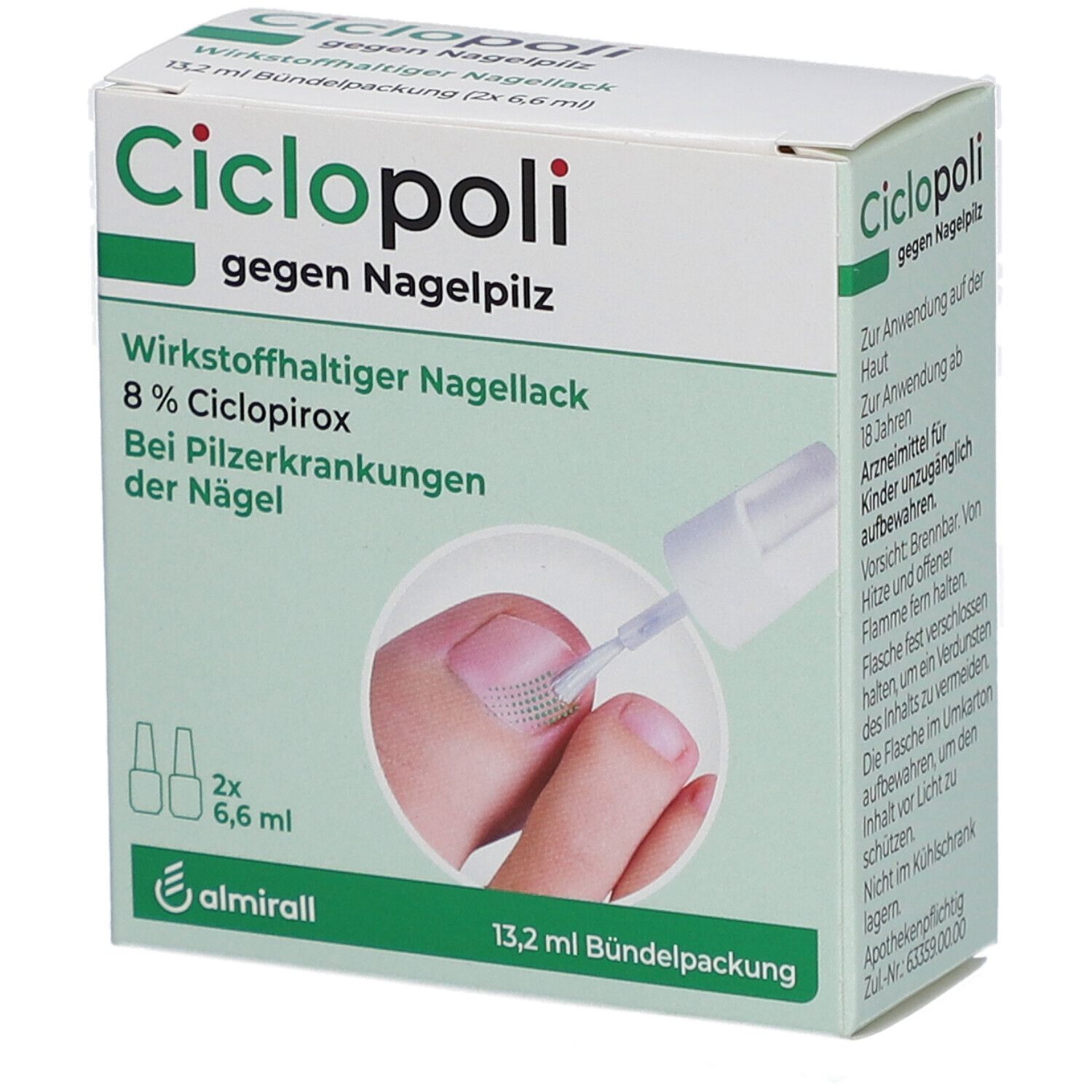 Der angezeigte Preis könnte seit dem letzten Update gestiegen sein - EAN: 4150022476676 - Ciclopoli® - Die Nr. 1* gegen Nagelpilz Ciclopoli® gegen Nagelpilz ist der einzige wasserlösliche Anti-Pilz-Lack mit dem Wirkstoff Ciclopirox 8%. Ciclopoli wirkt effektiv gegen alle gängigen Nagelpilzerreger und auch deren Sporen. Der Ciclopoli®... - Zustand: NEW - bei SHOP APOTHEKE - gefunden von Buycentral Diese Doppelpackung von Ciclopoli ist ideal für eine längere Behandlung oder bei stärkerem Befall. ![]() Ciclopoli gegen Nagelpilz wirkstoffhalt.Nagellack 2x6,6 ml Wirkstoffhaltiger Nagellack