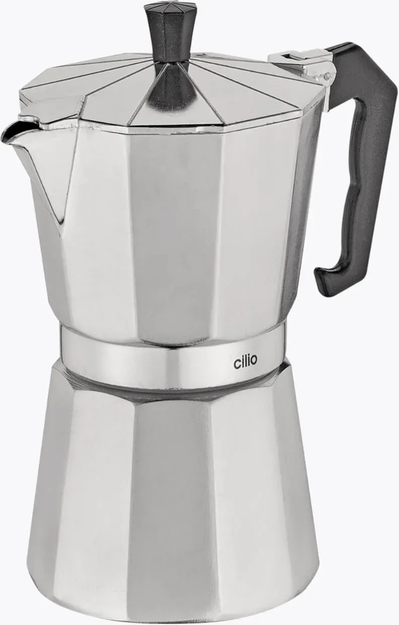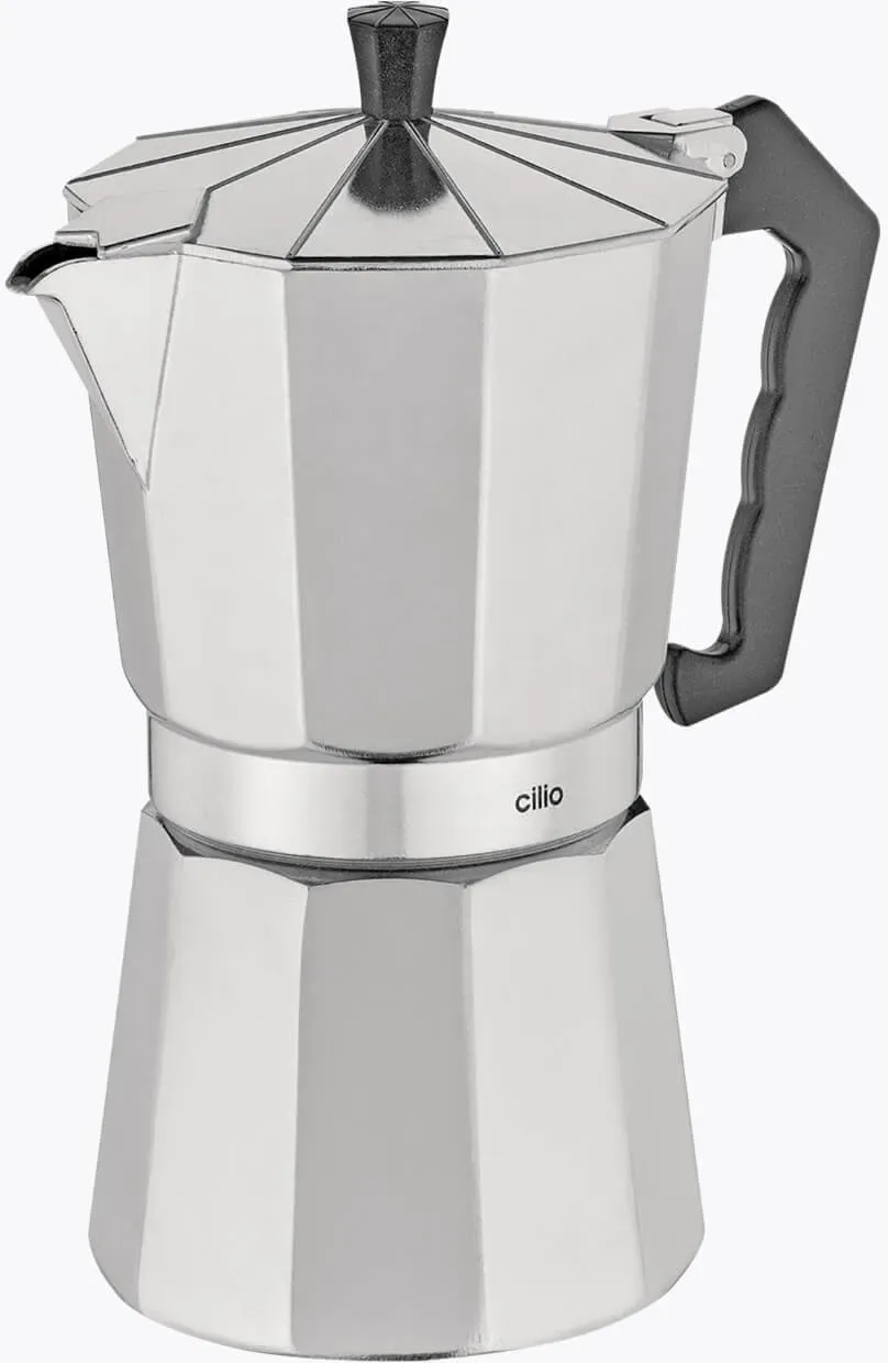 2 Werktage, Express 1 Werktag in_stock - Technik & Licht Haushaltsgeräte Kaffeemaschinen & Zubehör Kaffeemaschinen Kaffee- und Espressomaschinen - EAN:4017166320619 - Erleben Sie dem cilio Espressokocher CLASSICO wahren Kaffeegenuss. Der klassische Kocher in achteckiger Form besteht aus Aluminium und bereitet bis zu 6 Tassen Espresso zu. Die Zubereitung gestaltet sich einfach: Befüllen Sie den Unterteil mit Wasser, füllen Sie Espressopulver in den Siebeinsatz und streichen Sie es glatt. Die Kanne fest zuschrauben und auf eine Platte aus einem Gas- oder Elektroherd stellen. Ihr Espresso ist fertig, sobald Sie das typische Wasserbrodeln vernehmen und es nach frischem Kaffee duftet. ... - gefunden von Kelkoo Ein größerer Espressokocher für 9 Tassen, ideal für Familien oder wenn man öfter Gäste hat. ![]() ![]() CILIO Espressokocher CLASSICO für 9 Tassen aus Aluminium