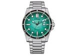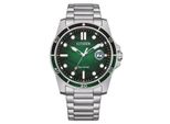 Citizen - EAN: 4974374339492 - Citizen Herrenuhr AW1811-82XDie Citizen Herrenuhr AW1811-82X mit ihrem sportlich-eleganten Design ist der perfekte Begleiter für jeden Tag. Das Zifferblatt besticht durch einen Farbverlauf von Grün bis Schwarz mit einer einzigartigen Wave-Struktur, die je nach Blickwinkel unterschiedlich stark zur Geltung kommt und der Uhr einen besonderen Ausdruck verleiht.Die lumineszierenden Indizes im Strich- und Punktdesign sowie die leuchtenden Zeigerspitzen sorgen für optimale Ablesbarkeit auch bei Dunkelheit. Das Kristallglas ist mit einer Lupe über dem Datumsfenster auf der 3-Uhr-Position ausgestattet, die das Datum besser lesbar macht.Die silberne Lünette zeigt den Farbverlauf des Zifferblatts mit einer 5-Minuten-Skala. Gehäuse und Gliederarmband bestehen aus Edelstahl und sind mit einer Drückerfaltschließe versehen. Im Inneren arbeitet ein Eco-Drive Quarzwerk Kaliber J810, das durch Solarenergie geladen wird und eine Gangreserve von ca. 240 Tagen bietet.Mit einer Wasserdichtigkeit von 10 Bar ist die Uhr ideal für Sport und Freizeit geeignet.Technische DatenZeitanzeige: AnalogUhrwerk: Quarzwerk mit Eco-Drive Antrieb, Kaliber J810Gehäusedurchmesser: 41,5 mmGehäusehöhe: 11,8 mmZifferblattfarbe: Grüner Farbverlauf mit Wave-Struktur, nachleuchtender PunktindexArmbandmaterial: Silberfarbenes EdelstahlarmbandZiffern: PunktindexFunktionen: Stunde, Minute, Sekunde, Datum, 24h-AnzeigeGehäusematerial: Silberfarbenes EdelstahlgehäuseUhrglas: Kristallglas mit ... ![]() kaufland.d e Citizen Herren EcoDrive AW1811-85X