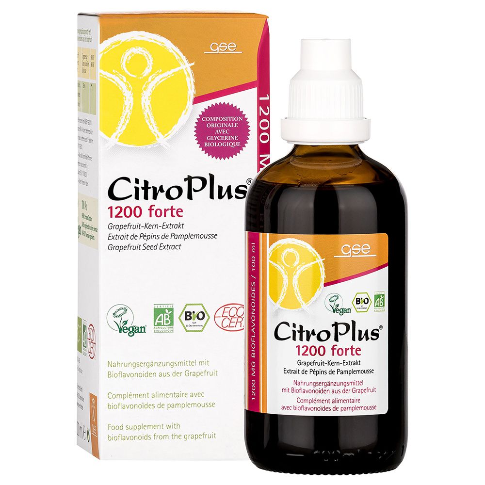 Citro plus 1200 forte META PreisvergleichMit dem Meta-Preisvergleich suchen Sie gleichzeitig bei den großen Preisvergleich Portalen!Jetzt live Suche nach citro plus 1200 forte starten! Citro plus 1200 forte KaufberatungCitroPlus 1200 Forte ist ein bio-zertifizierter Grapefruitkernextrakt als Nahrungsergänzungsmittel mit hohem Gehalt an Bioflavonoiden (1200 mg pro 100 ml) und Vitamin C, der das Immunsystem unterstützt.[1][2][3] Beachten Sie die Dosierung (3 x 15 Tropfen täglich, nicht überschreiten), Lagern außer Reichweite von Kindern, nach Anbruch innerhalb 6 Monaten verbrauchen und es nicht als Ersatz für eine ausgewogene Ernährung nutzen.[1][4] Wichtige Merkmale und BeliebtheitDas Produkt von GSE Vertrieb GmbH ist in flüssiger Form (meist Braunglas) erhältlich, vegan, glutenfrei, lactosefrei und ohne Palmöl-Glycerin oder synthetische Zusätze - diese Eigenschaften werden in allen Quellen hervorgehoben und deuten auf hohe Beliebtheit bei naturnahen Käufern hin.[2][3][5][6][7] Beliebte Aspekte: