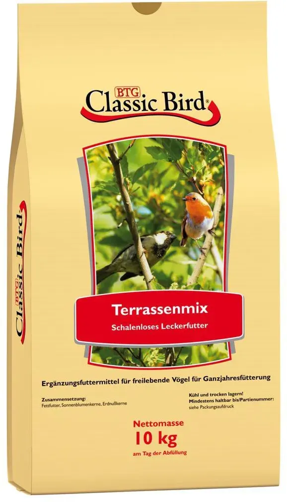 4 Händlerangebote bei billiger.de - Kategorie: Vogelfutter - BTG Classic - BTG Classic Bird Classic Terrassenmix, Samen, 10 kg, Fettfutter, Sonnenblumenkerne geschält , Erdnußkerne BTG Classic Bird Classic Terrassenmix. Produkttyp: Samen, Volumen (g): 10 kg, Inhaltsstoffe: Fettfutter, Sonnenblumenkerne geschält , Erdnußkerne Classic Bird Terrassenmix, 10kg Eine hochwertige und energiereiche Mischung ohne Schalen bietet Classic Bird Terassenmix, schalenlos. Dieses leckere Futter können Sie das ganze Jahr über verfüttern. Zudem hinterlässt es keine Schalenrückstände und eignet sich somit hervorragend für Balkon oder Terrasse. - GTIN:4250016803300 ![]() ![]() CLASSIC BIRD Vogelfutter Terrassenmix 10 kg ? Schalenloses Ganzjahresfutter mit Erdnusskernen & geschälten Sonnenblumenkernen ? Premium Wildvogelfutter für Balkon & Terrasse