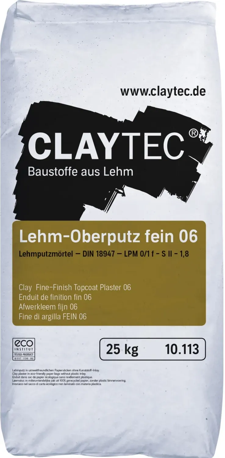 Zustand: Neu - 0,01 € / kg - Putz - Claytec CLAYTEC - - EAN: 4042356101136 - Marke: Claytec - Verkäufer: RÖHRS BAUMARKT | Otto Röhrs GmbH im amazon.de Marketplace ![]() ![]() Claytec Lehm-Oberputz fein 06 ? 25?kg Lehmputz für Innenbereich, einlagiger Hand- & Maschinenputz, feinkörnig 0?0,6?mm, ökologisch & diffusionsoffen, für Lehm-Unterputz & Lehmbauplatten