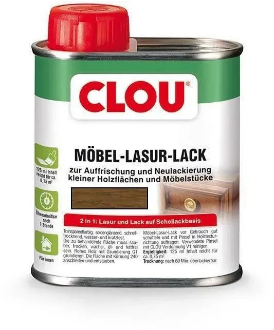 Zustand: Neu - 70,32 € / l - Beizen - CLOU Alfred Clouth Lackfabrik GmbH Co. KG - - EAN: 4007141035089 - gebrauchsfertig schnelltrocknend seidenglänzend transparentfarbig wasser-und kratzfester Überzug - 4 Händler im amazon.de Marketplace ![]() ![]() Möbel-Lasur-Lack L4 natur 0,125 L