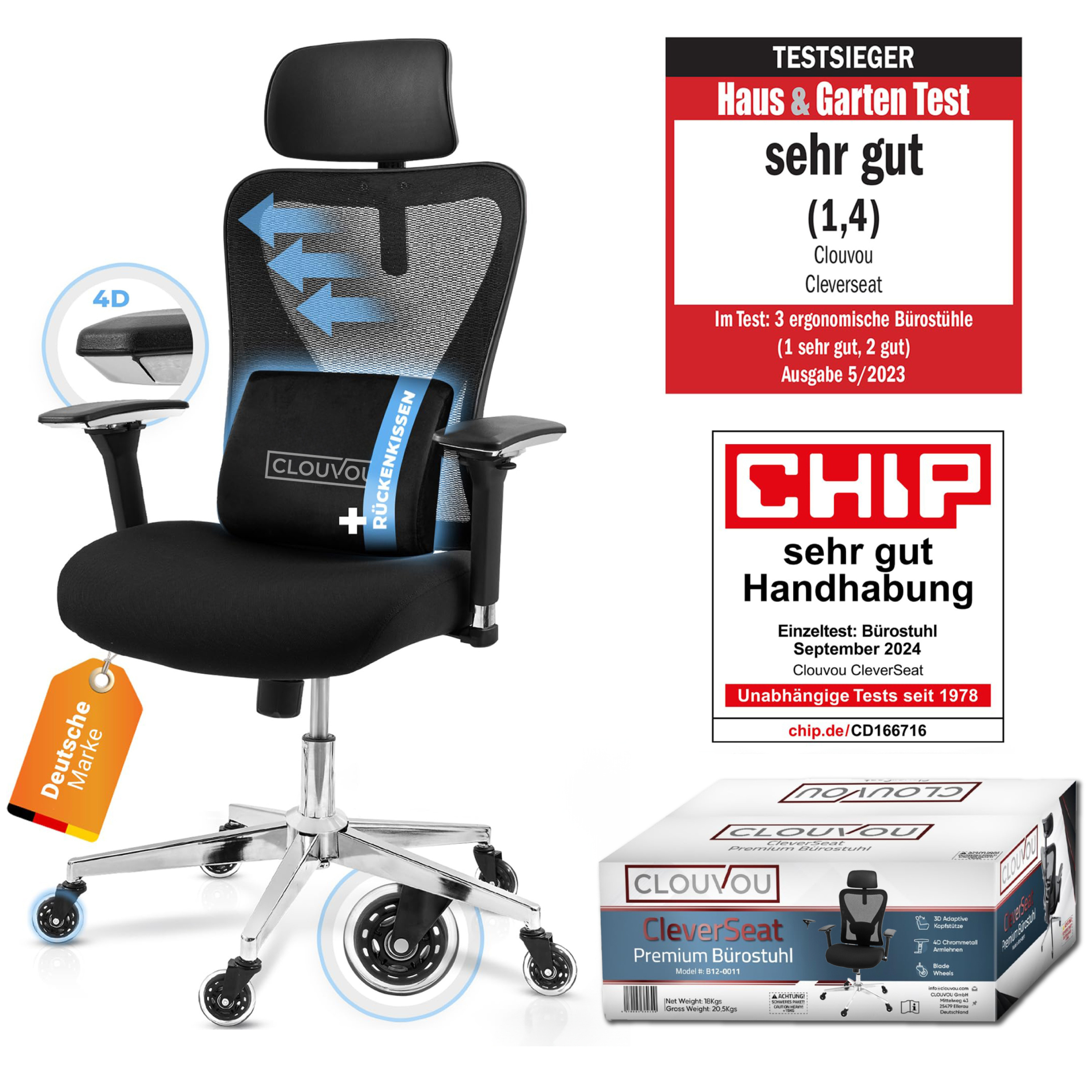 EAN: 4270003380355 - ORTHOPäDISCHER KOMFORT Integriertes Rückenkissen und flexible Lendenwirbelstütze fördern die Rückengesundheit und bieten erstklassigen Komfort für lange Arbeitstage.4D-ARMLEHNEN Verstellbare Armlehnen aus Chrom-Metall, die in alle Richtungen justierbar sind, sorgen für perfekte Anpassung und unvergleichlichen Komfort am Schreibtisch.ATMUNGSAKTIVER MESH-BEZUG Hochwertiger, elastischer Bezug aus Nylon fördert die Luftzirkulation und hält dich auch bei langen Arbeitsphasen angenehm kühl und bequem.FLEXIBLE RüCKENLEHNE 135 neigbare Rückenlehne, Kunstleder-Kopfstütze und individuell anpassbare Lendenstütze für optimale Unterstützung in jeder Sitzposition.LAUTLOSES ROLLEN Exklusive Blade Wheels für müheloses und kratzfreies Gleiten auf allen Bodenbelägen perfekt für den täglichen Einsatz auf Parkett und Teppich!Ergonomischer Bürostuhl mit 4D-Armlehnen und orthopädischem Komfort Perfekt für Home Office und BüroDieser ergonomische Bürostuhl bietet höchsten Komfort und Gesundheit am Arbeitsplatz. Mit einem orthopädischen Rückenkissen und einer anpassbaren Lendenwirbelstütze fördert er eine gesunde Sitzhaltung und beugt Rückenschmerzen auch bei langen Arbeitsstunden vor. Die Rückenlehne ist bis zu 135 neigbar und die flexible Kunstleder-Kopfstütze passt sich deinem Körper optimal an.Die 4D-Armlehnen aus Chrom-Metall bieten maximale Flexibilität und lassen sich individuell einstellen, um den ergonomischen Stuhl perfekt auf deine Bedürfnisse abzustimmen. Der ... ![]() ![]() CLOUVOU CleverSeat Bürostuhl Ergonomisch [TESTSIEGER] Schreibtischstuhl 100% individuell einstellbar | Büro Stuhl & Gaming Stuhl | Computerstuhl Home Office Chair Ergonomic | Drehstuhl 150 kg