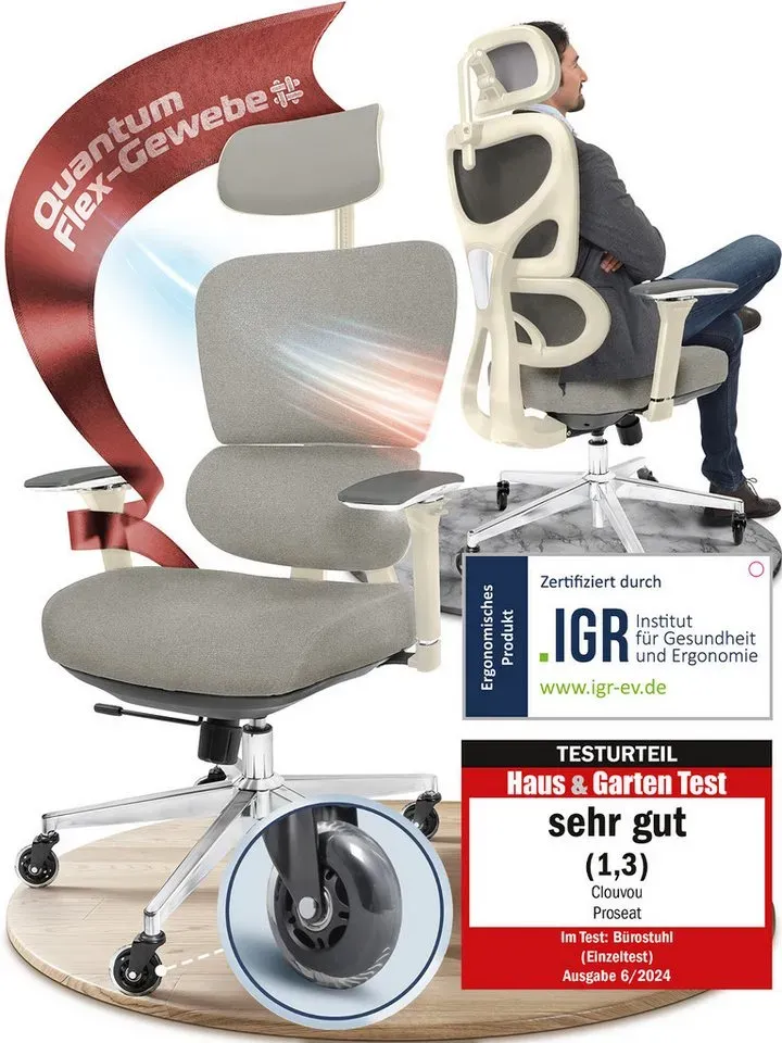 Clouvou proseat META PreisvergleichMit dem Meta-Preisvergleich suchen Sie gleichzeitig bei den großen Preisvergleich Portalen!Jetzt live Suche nach clouvou proseat starten! Clouvou proseat KaufberatungDer Clouvou ProSeat - Dein ergonomischer Bürostuhl im ÜberblickDer Clouvou ProSeat ist ein ergonomischer Bürostuhl des deutschen Startups Clouvou, der sich durch ein ausgezeichnetes Preis-Leistungs-Verhältnis auszeichnet[1][2]. Er richtet sich an alle, die lange am Schreibtisch arbeiten - ob im Homeoffice, beim Gaming oder beim Lernen. Preisbereich und aktuelle AngeboteDer Clouvou ProSeat liegt preislich bei etwa 280-350 Euro[2][10]. Besonders während Black-Friday-Aktionen findest du ihn ab 279,99 Euro[4]. Damit bietet er ein sehr gutes Preis-Leistungs-Verhältnis für die gebotenen Features. Beliebte und wichtige ProduktmerkmaleDie folgenden Ausstattungsmerkmale machen den Clouvou ProSeat besonders attraktiv: Ergonomische Kernfeatures: Der Stuhl verfügt über 4D-Armlehnen, die vielseitig verstellbar sind, sowie eine individuell einstellbare Lendenwirbelstütze (ProSupport-Technologie)[1][3]. Die höhenverstellbare 3D-Kopfstütze aus PU-Leder bietet zusätzliche Nackenunterstützung[1]. Die Rückenlehne ist bis zu 135 Grad neigbar und arretierbar, was verschiedene Arbeitspositionen ermöglicht[1][5]. Komfortmaterialien: Das QuantumFlex-Gewebe ist thermoregulierend und atmungsaktiv - es sorgt ganzjährig für ein angenehmes Sitzklima und verhindert Überhitzung bei langen Sitzzeiten[1][3]. Das Material riecht zudem nicht nach Chemikalien[12]. Beweglichkeit und Stabilität: Die Blade Wheels sind leise und bodenschonend und gleiten mühelos über alle Bodentypen (Parkett, Fliesen, Teppich)[1][3]. Das verchromte Metallgestell bietet eine stabile Konstruktion[5]. Sitztiefenverstellung: Diese Funktion ermöglicht eine präzise Anpassung an individuelle Körpermaße[1][2]. Technische Spezifikationen
