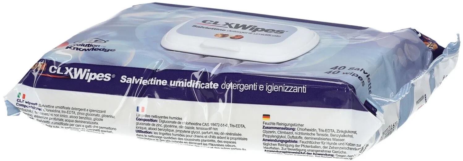 CLX Wipes - EAN: 8009722002622 - Feuchte Reinigungstücher für Hunde und KatzenAnwendungsgebieteTherapieunterstützend bei:Infektionen der Haut (Pfotenballen/Zehenzwischenräume/Hautfalten (z. B. bei Nasenfalten pyodermien)) Reinigung von schwer zugänglichen Hautbereichen, wo die... - bei shop-apotheke.com - aus Yadore Produktdaten ![]() CLX Wipes feuchte Reinigungstücher f.Hunde/Katzen 40 St Tücher