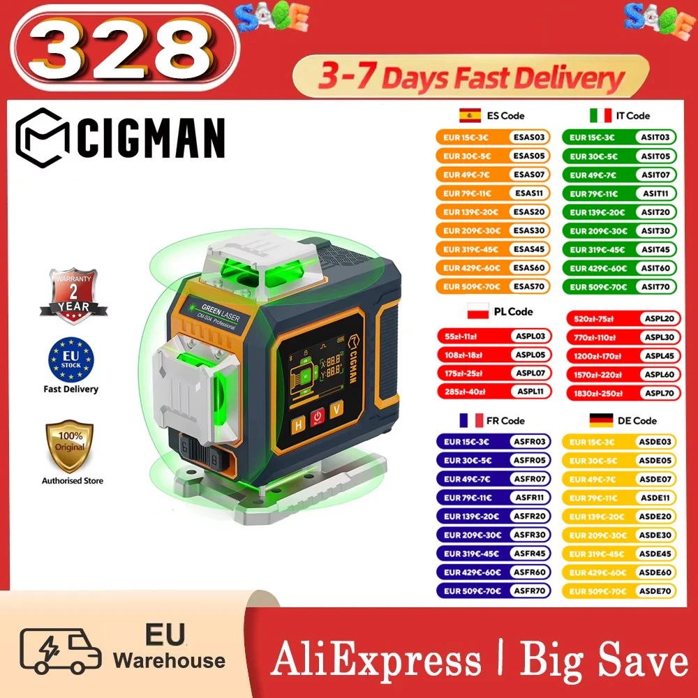 Cigman - CIGMAN CM-S04 16-Linien-Laser-Wasserwaage mit LCD-Display 4 360 Grüner Strahl 1,5 mm/5 m Hochpräzise automatische Nivellierung, APP und Fernbedienung - bei de.aliexpress.com - aus Yadore Produktdaten ![]() CIGMAN CM-S04 16-Linien-Lasernivelliergerät mit LCD, 4 360 Grüner Strahl, 1,5mm/5m Genauigkeit, Selbstnivellierung, 2600mAhx2, APP- & Fernbedienung