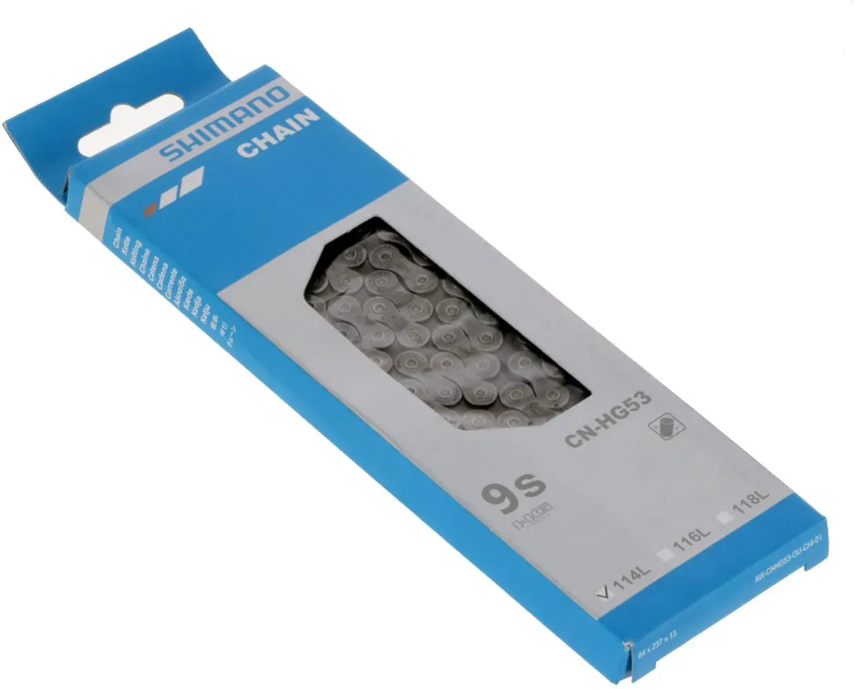 Kategorie: Ketten & Kassetten - Shimano - GTIN:4524667040880 - Kette, 114 Glieder CN-HG53 9-Fach spezial Vernietet, Super-Schmal - 26,95 Euro bei Amazon Marketplace Sports - gefunden von billiger.de Diese Shimano Kette ist eine gute Wahl für alle, die eine 9-fach Kette mit 116 Gliedern und Nietverschluss suchen. ![]() ![]() Shimano Kette CN-HG53 9-fach, 116 Glieder Nietverschluss, grau/braun grau 116