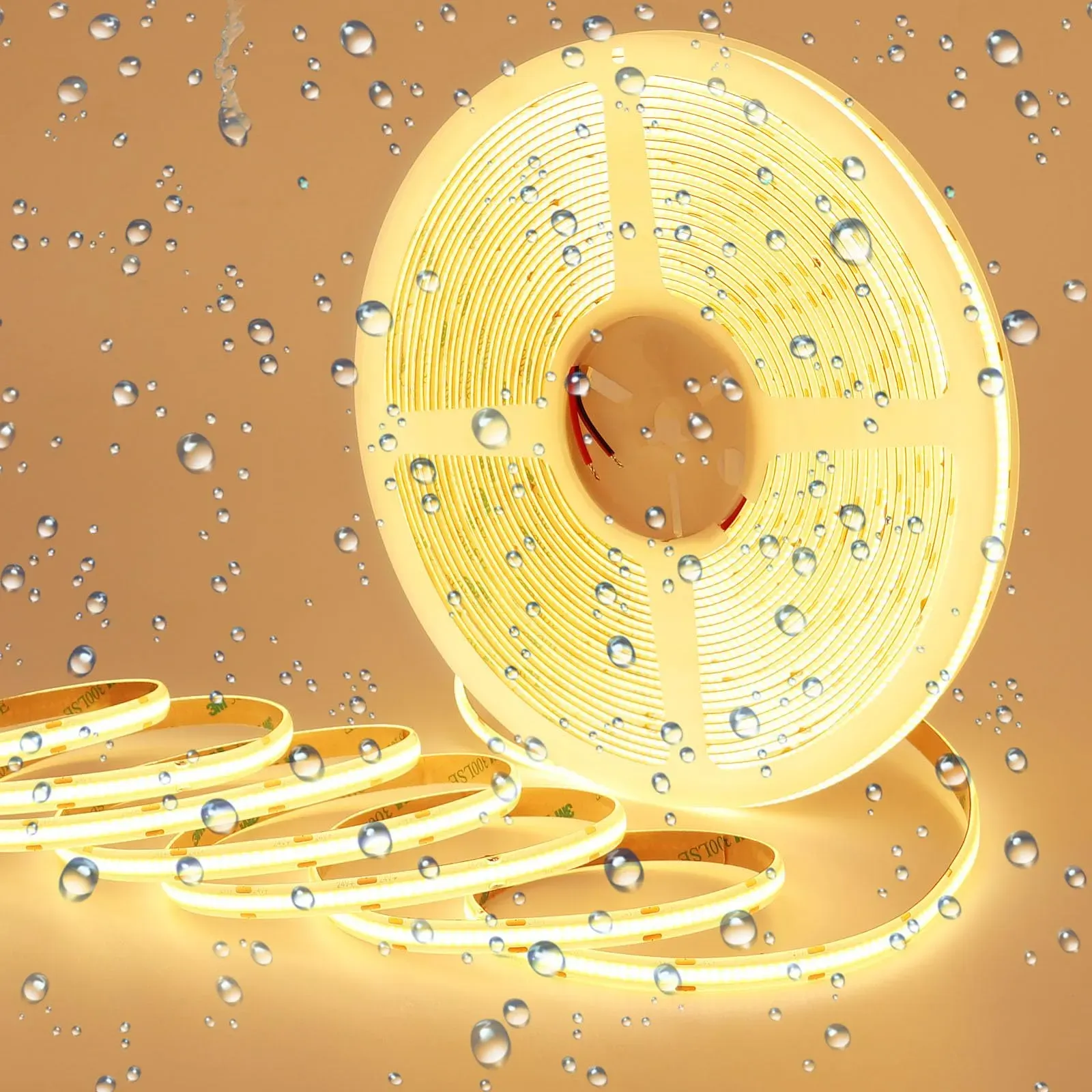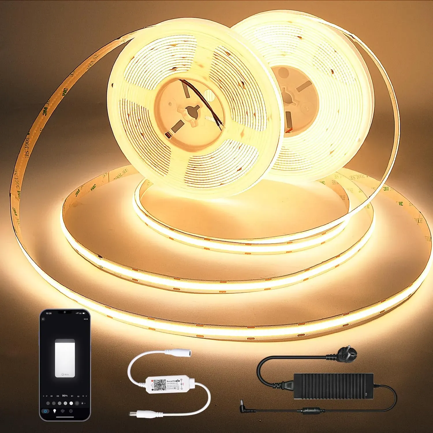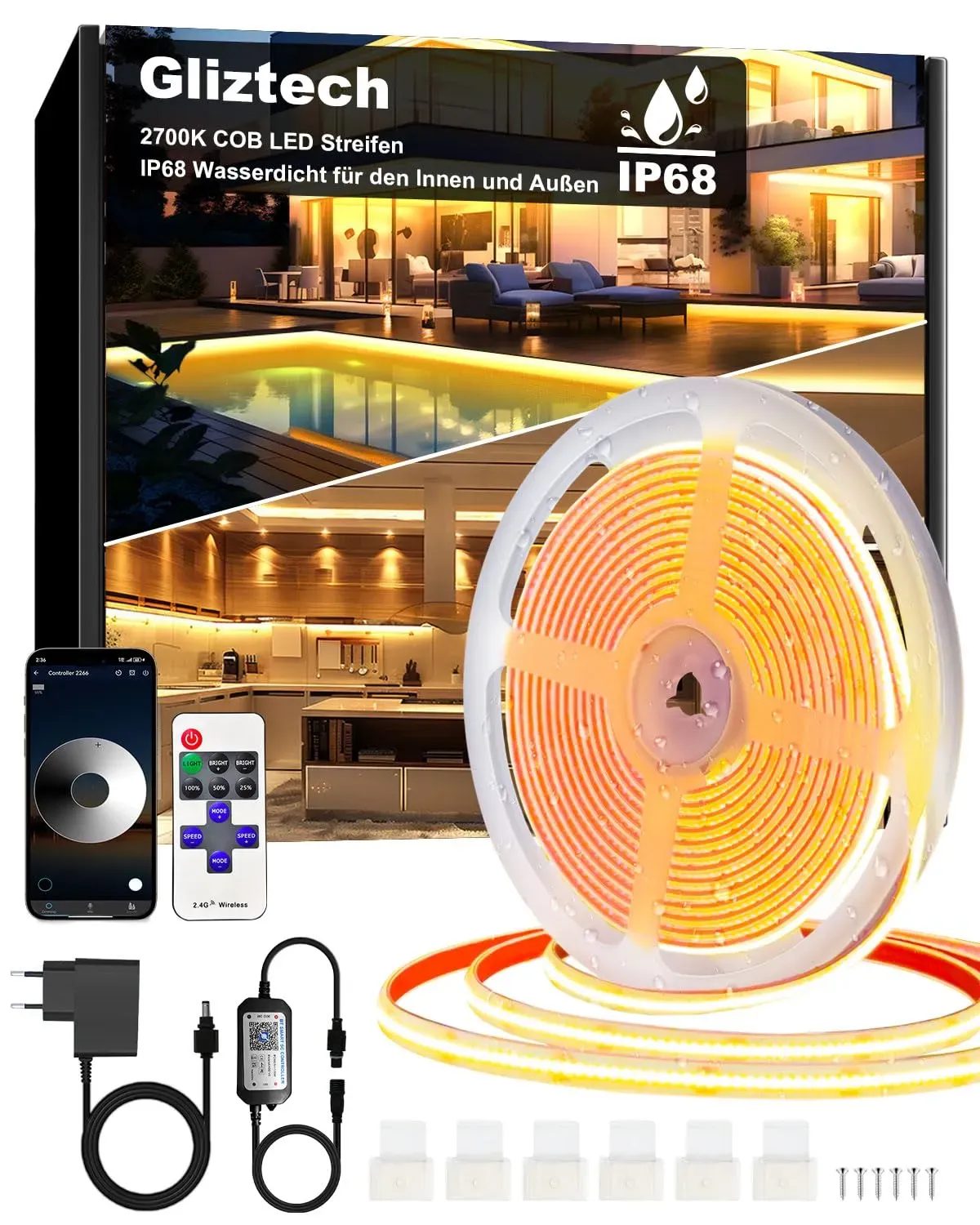 EEK: F - Kategorie: LED-Lampen - gliztech - Verbesserter IP68 Waterproof Led Strip Outdoor: Gliztech cob led streifen ist in langlebiges Silikon mit einer wasserdichtigkeitsklasse von IP68 eingehüllt. Nicht nur der led strip selbst ist wasserdicht, sondern auch der Controller und der DC Anschluss sind so konzipiert, dass sie eine sicherere Verwendung im Außenbereich gewährleisten. Dieser warmweiße COB LED streifen ist eine verbesserte Version herkömmlicher SMD led streifen und liefert helleres, weicheres und gleichmäßigeres Licht mit einem nahtlosen Lichtschlauch und ohne sichtbare schwarze Flecken. 24V Dimmable Cob Led Mit Ultraheller Helligkeit: Passen Sie die Helligkeit stufenlos von 0 bis 100 % mit der Fernbedienung oder App an. Mit hoher Lichtausbeute und einem Farbwiedergabeindex von 90+ sorgt dieser led streifen für eine lebendige und natürliche Beleuchtung. Sein 180 Grad Strahlwinkeldesign bietet eine 50 % breitere Lichtabdeckung, während die mehreren Chips an Bord eine gleichmäßige Beleuchtung ohne dunkle Flecken gewährleisten. Die Stromversorgung erfolgt über ein led strip 24v Netzteil (im Lieferumfang enthalten). Die niedrige Spannung und die effiziente Wärmeableitung machen die Verwendung auch in der Nähe von Kindern und Haustieren sicher. Fernbedienung und App Steuerung: Cob led streifen warmweiss mit 2,4 G Fernbedienung bietet einfachen Zugriff auf alle Standardeinstellungen und enthält anpassbare Tasten für Ihre bevorzugten Lichtkonfigurationen. Cob led ... Der GEYUEYA Home Wi-Fi LED Streifen bietet smarte Funktionen wie App-Steuerung, Dimmbarkeit, Timing und Musik-Sync, was ihn ideal für moderne Wohnraumgestaltung macht. ![]() ![]() GEYUEYA Home Wi-Fi LED Streifen COB 15M, Warmweiss LED Strips 24V Mit Fernbedienung, Dimmbar, Timing Funktion, Musik-Sync, Dekoration für Küchenschränke, Lagerschränke und Feiertagsdekoration, Feiertage