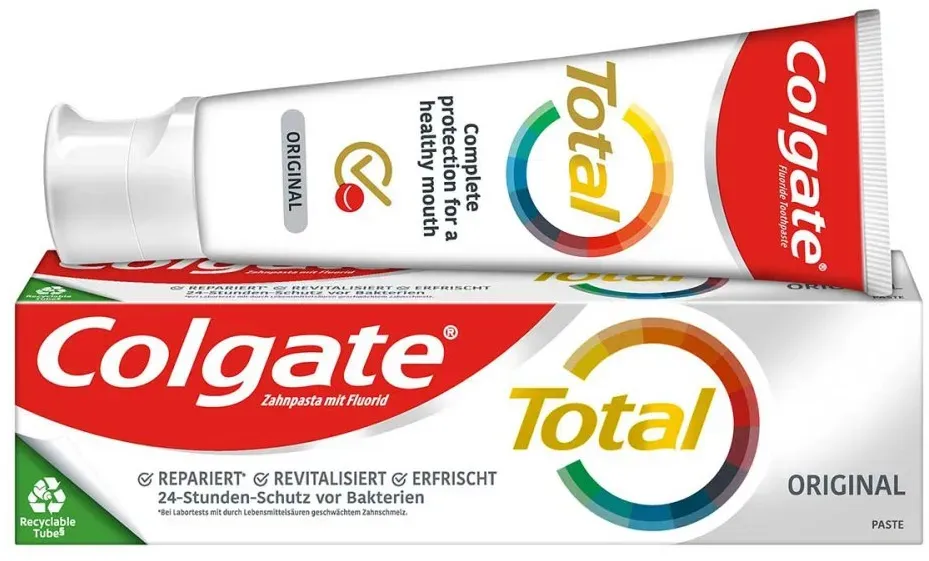 Verfügbarkeit: 2-4 Werktage - 57,87 €/l - Kategorie: Zahnpflegeartikel - Colgate - GTIN:8718951227262 - PZN:15235140 - Colgate Total Original Zahnpasta können in Ihrer Versandapotheke www.apo.com erworben werden. - 4,34 Euro bei apo.com - gefunden von billiger.de Ein gutes Angebot für eine 75 ml Tube auf eBay für 4,59 Euro. ![]() ![]() COLGATE TOTAL - Zahnpasta Original eBay 75 ml