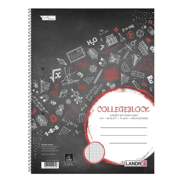 Papierwaren Wohnen Arbeiten Büro- Schreibwaren - - Mit dem herlitz Collegeblock x.book Lineatur 28 kariert DIN A4 Innen- und Außenrand optimalen Schreibkomfort genießenDer herlitz Collegeblock x.book Lineatur 28 kariert DIN A4 Innen- und Außenrand ist sowohl im Büro, in der Schule als auch in der Uni unverzichtbar. Denn der praktische Helfer dient Ihnen als unerlässlicher Begleiter bei Konferenzen, Besprechungen, Firmenrundgängen, Vorlesungen, im Unterricht u. v. m.Mit Einband aus KartonDank des bewährten DIN A4-Formats stellt Ihnen der herlitz Collegeblock x.book eine ausreichende Fläche zur Nutzung bereit. Der flexible Einband aus Karton bleibt trotz seines leichten Designs widerstandsfähig und langlebig. Die Spiralbindung seitlich ermöglicht ein einfaches Umblättern und eine bequeme Nutzung des gesamten Blattes. Welche Art von Bleichung wurde bei der Herstellung gewählt?Für die Produktion von Blöcken werden verschiedene Bleichungs- und Herstellungsverfahren verwendet. Nachfolgend eine Erklärung zu den Produktionseigenschaften dieses Modells: ECF (Elementary Chlorine free) verbietet den Einsatz von Chlorgas. 'Elementar chlorfrei gebleicht' bedeutet, dass das elementare Chlor (Cl2) durch andere Chlorverbindungen ersetzt wurde.Kariert und praktisch - ideal für übersichtliche AufzeichnungenDer Block hält 80 Blatt bereit. Mit einem Papiergewicht von 70 g/m² bietet der Block eine leichte, flexible Grundlage für alltägliche Notizen und Mitschriften, die sich einfach ... Dieser Landré Collegeblock ist eine sehr preiswerte Option für kariertes Papier. ![]() Landré Collegeblock A4+ kariert rot