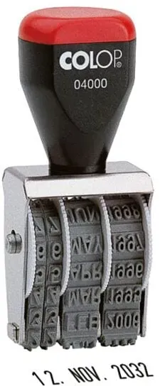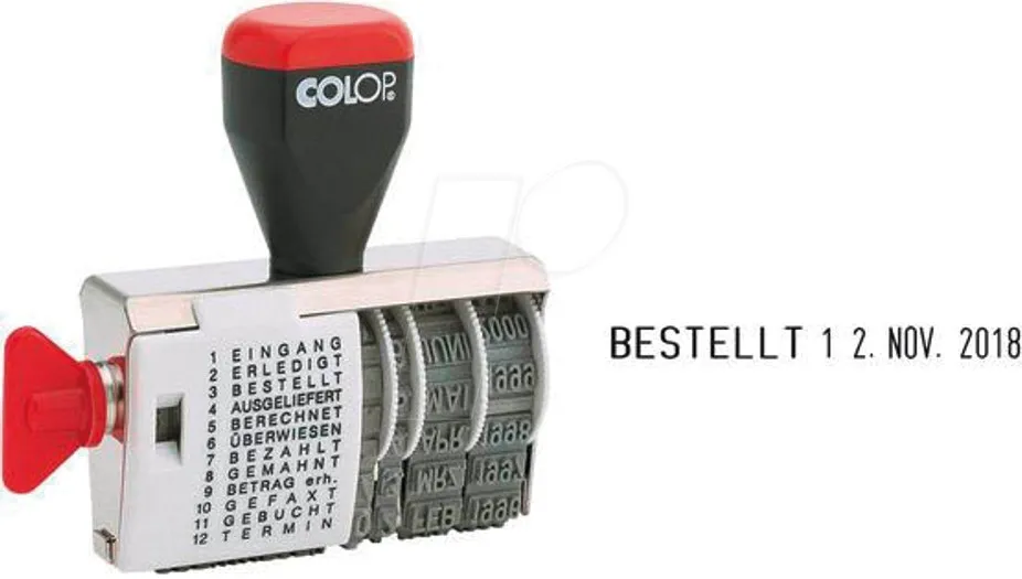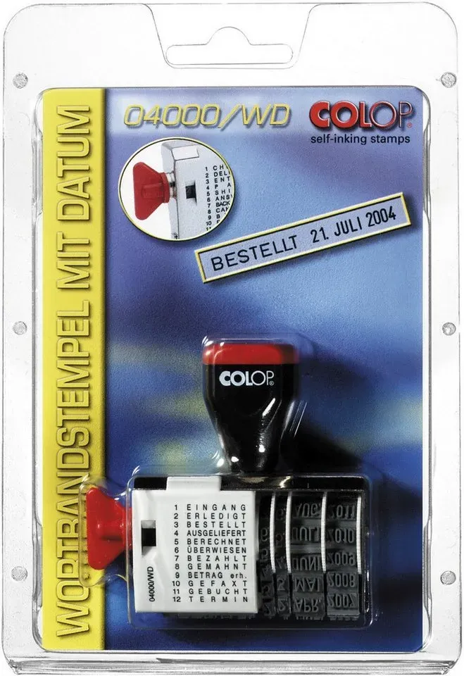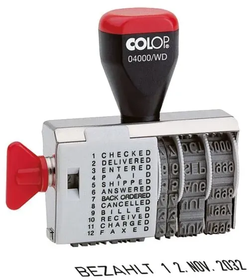 Kategorie: Sonstige Büroutensilien - Colop - GTIN:9004362343578 - Colop Wortbandstempel 04000/WD mit Datum. Mit 12 verschiedenen Standard-Büro-Texten. Stempeltext verstellbar mit Flügelmutter. Schrifthöhe: 4 mm Texte: EINGANG, BEZAHLT, ERLEDIGT, GEMAHNT, BESTELLT, BETRAG erh., AUSGELIEFERT GEFAXT, BERECHNET, GEBUCHT, üBERWIESEN, TERMIN - 12,01 Euro bei stempelshop24.de - gefunden von billiger.de Dieser Datums- und Textstempel von reichelt.de ist mit 12,95 Euro eine solide Option für den kombinierten Einsatz. ![]() ![]() COLOP 04000/WD - COLOP Datums- und Textstempel