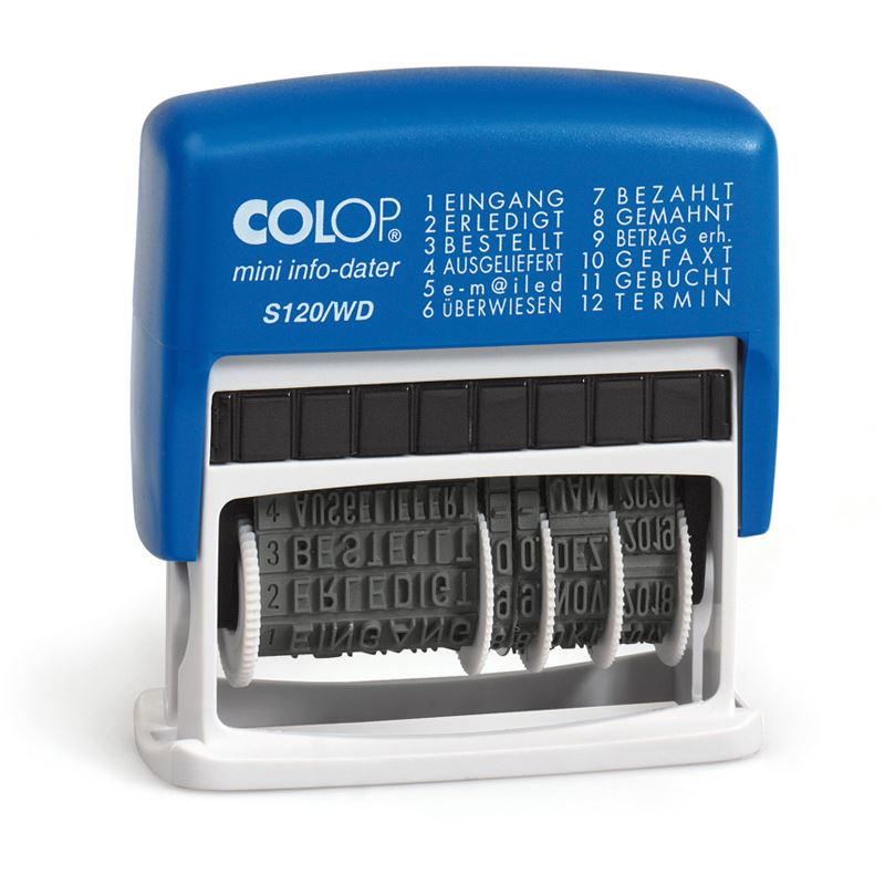Zustand: Neu - Stempel - COLOP - Mini-Info-Dater S 120/WD - EAN: 4260430690219 - - Verkäufer: Bürowelt-Blank im amazon.de Marketplace ![]() ![]() Colop S120/WD MiniInfoDater Schrifthöhe 4 mm Kissen blau/rot 12 Texte Farbe Blau