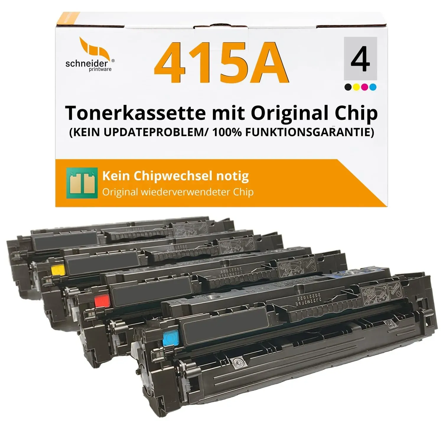 Kategorie: Toner - halloya - Produktname: Halloya 415X Toner Kompatibel mit HP 415X 415A W2030X Toner (mit Chip, nicht original) Kompatibel mit: HP Color Laserjet Pro MFP M479fdw M479fdn M479fnw M479dw M479, Color Laserjet Pro M454dn M454dw M454 Drucker Seitenausbeute: 7.500 seiten pro 415X schwarze tonerkartusche (W2030X) und 6.000 seiten pro 415X farbtonerkartusche (W2031X W2032X W2033X), bei 5% deckung von A4 Paketinhalt: 1 x Schwarz 415X W2030X, 1 x Cyan 415X W2031X, 1 x Gelb 415X W2032X, 1 x Magenta 415X W2033X Toner Außergewöhnliche Qualität: Die Tonerkartusche 415X 415A verfügt über einen intelligenten Chip für schnelle Erkennung. Druckfarben: Lebhaft, klar und langlebig, erfüllen Ihre hohen Anforderungen an die Druckqualität. - 89,99 Euro bei Amazon Marketplace CE - gefunden von billiger.de Dieses Angebot ist empfehlenswert für Nutzer, die Wert auf Original-Chips und Kompatibilität ohne Update-Probleme legen. ![]() ![]() schneiderprintware [Mit Original-Chip | wiederverwendet] Toner kompatibel für 415A W2030A-W2033A für HP Color Laserjet Pro MFP M479dw M479fdw M479fdn Pro M454dn M454dw | Keine UPDATEPROBLEME