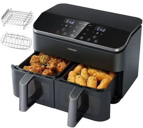 Auf Lager Versand durch AmazonCOSORI Airfryer, Testsieger der Stiftung Warentest, Heißluftfritteuse 2 Kammern, 8,5L Heissluftfritteuse mit Sichtfenster, Metall-Innenraum reduziert Kunststoffkontakt