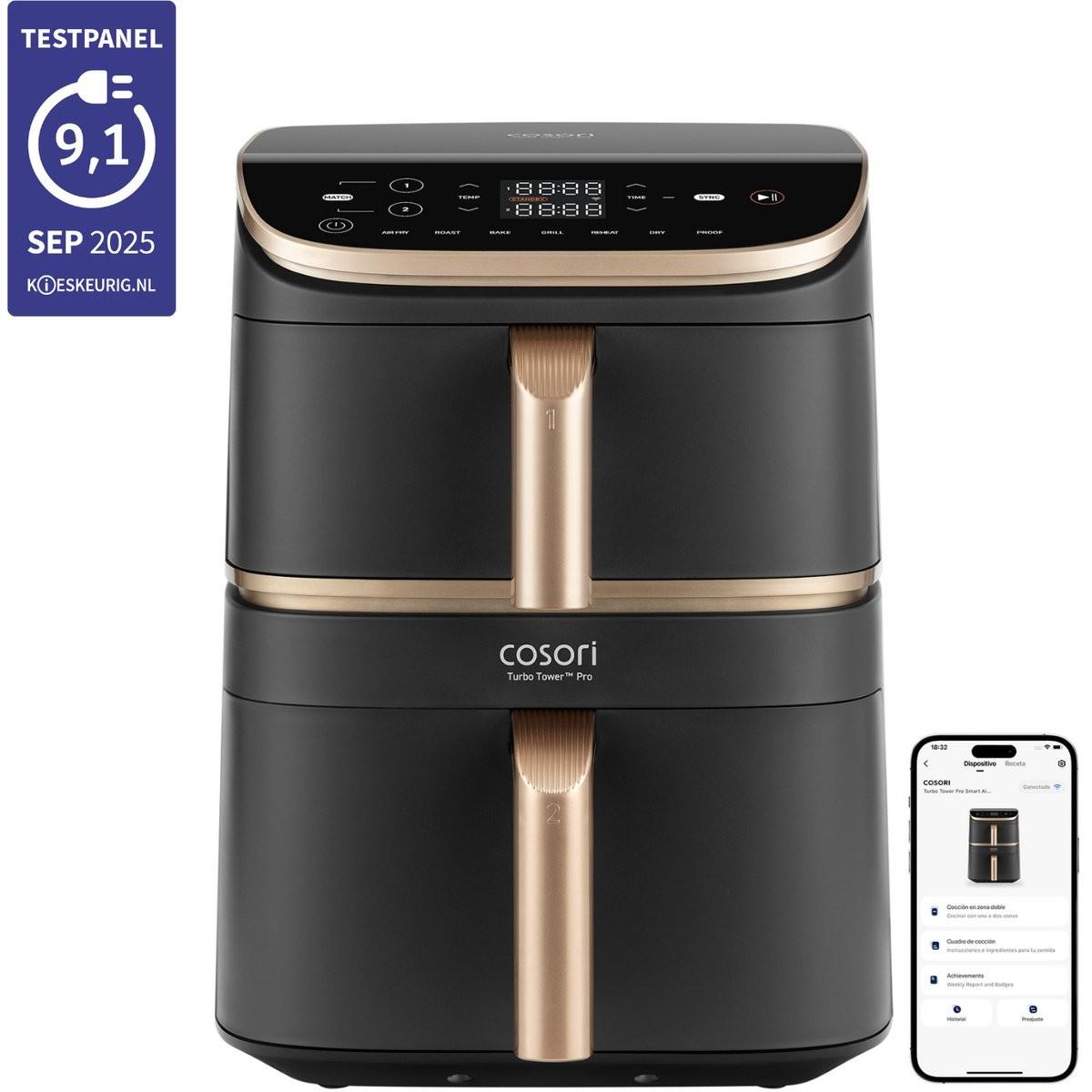Kategorie: Fritteusen - COSORI - GTIN:0810123675210 - Der Cosori Turbo Tower Pro Airfryer ist eine vielseitige Heissluftfritteuse, die eine gesunde und effiziente Zubereitung von Speisen ermöglicht. Mit einem grosszügigen Fassungsvermögen von 10,8 Litern eignet sich dieses Gerät ideal für die Zubereitung von Mahlzeiten für mehrere Personen. Die innovative Heisslufttechnologie sorgt dafür, dass Lebensmittel knusprig und gleichmässig gegart werden, ohne dass dabei grosse Mengen öl benötigt werden. Die Temperatur kann von 30 °C bis zu hohen Temperaturen eingestellt werden, was eine breite Palette von Kochmöglichkeiten eröffnet, von sanftem Auftauen bis hin zu scharfen Braten. Die benutzerfreundliche Touch-Steuerung ermöglicht eine einfache Bedienung, während die leistungsstarke Leistung von 2630 Watt für eine schnelle und effiziente Zubereitung sorgt. Das elegante Design in Schwarz und Gold fügt sich harmonisch in jede Küche ein und macht den Turbo Tower Pro zu einem ansprechenden Küchenhelfer. - Grosses Fassungsvermögen von 10,8 Litern für die Zubereitung von Mahlzeiten für mehrere Personen - Heisslufttechnologie für fettfreies Frittieren und gleichmässiges Garen - Einstellbare Temperatur von 30 °C bis zu hohen Temperaturen für vielseitige Kochmöglichkeiten - Benutzerfreundliche Touch-Steuerung für einfache Handhabung. - 282,34 Euro bei Galaxus.de - gefunden von billiger.de Dieses Modell bietet eine große Kapazität von 10,8L und WiFi-Konnektivität für smarte Steuerung. ![]() ![]() COSORI Turbo Tower Pro Smart Chef Edition Freidora de Aire 10.8L WiFi Negra