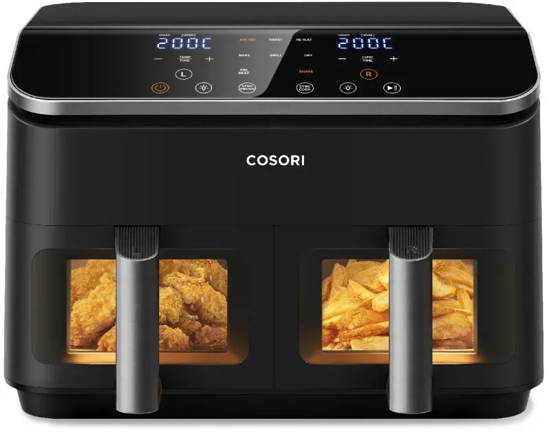 Kategorie: Fritteusen - COSORI - GTIN:0810123671731 - COSORI Air Fryer mit 2 Kammern, 8-in-1 Dual Zone XXL 8,5 L, verfügt über ein Zwei-Kammer-Design mit Sichtfenstern für ausgewogene Mahlzeiten; Enthält 50 Rezepte, energiesparend und geeignet für 1-5 Personen. - 152,99 Euro bei Joybuy - gefunden von billiger.de Dieses Modell mit 6,4 Litern, Dual Blaze und WLAN-Konnektivität ist ein beliebtes und gut bewertetes Produkt auf Amazon. ![]() ![]()