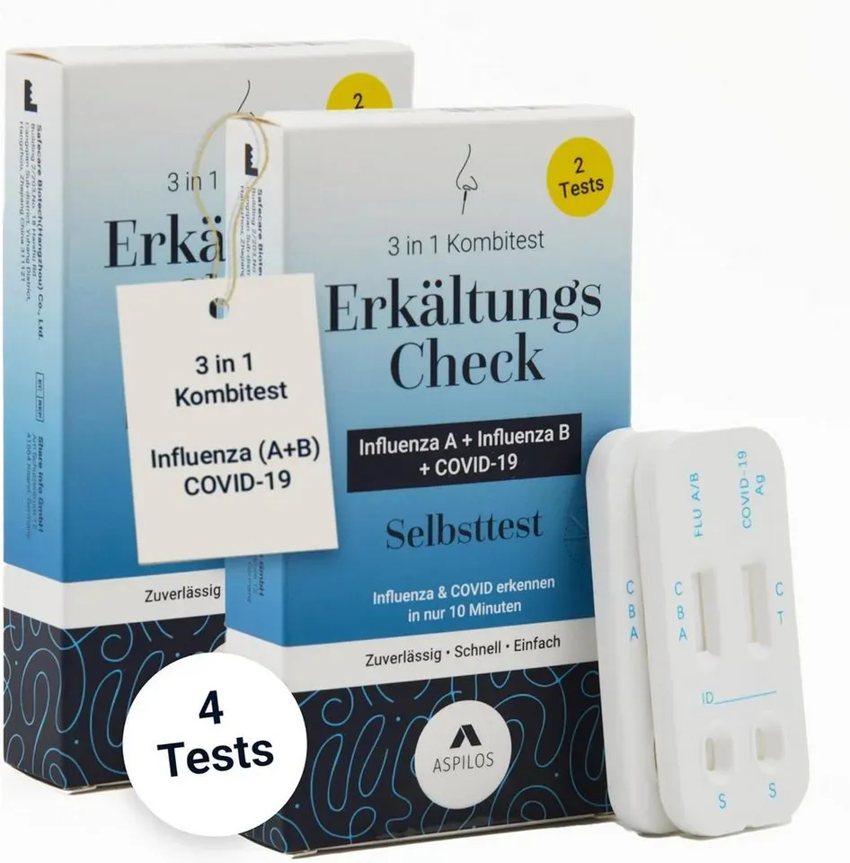 Der angezeigte Preis könnte seit dem letzten Update gestiegen sein - EAN: 0038657062560 - CorDx Kombitest zum Nachweis von SARS-CoV-2, Influenza A+B und RS-Viren - CE zertifiziert - Europaweit zugelassen - CE 2934 Sensitivität und Spezifität: - SARS-CoV-2: Sensitivität 89,09% Spezifität 100,00% - Influenza A: Sensitivität 100,00%... - Zustand: NEW - bei Metro.de - gefunden von Buycentral Dieser 3-in-1 Kombi-Schnelltest für Corona und Influenza A/B ist eine praktische Lösung für die Erkältungszeit. ![]() ![]() ASPILOS Influenza-Schnelltest 3-in-1 Corona & Influenza A/B Selbsttest für Zuhause in 15 Min 4er Set, präzise & sicher, Erkältungstest, 4er Pack, zum selbst durchführen, 2-tlg., Erkältungscheck, Covid Test, Influenza Schnelltest, Nasenabstrich