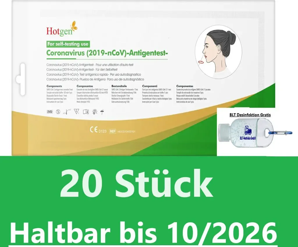 Der angezeigte Preis könnte seit dem letzten Update gestiegen sein - EAN: 4250397300023 - Antigen-Schnelltest zum qualitativen Nachweis des Coronavirus (SARS-CoV-2) - schnelle und zuverlässige Testergebnisse innerhalb von 10-15 Minuten - zur Eigenanwendung - Probeentnahme im unteren Nasenbereich - 95,37% Sensitivität, 99,13% Spezifität... - Zustand: NEW - bei Metro.de - gefunden von Buycentral Dieses 20er-Pack Hotgen Tests bietet ein gutes Preis-Leistungs-Verhältnis und eine lange Haltbarkeit bis 2026. ![]() ![]() Beijing Hotgen Biotech Co. 20x Hotgen BIO-TECH COVID-19 & Antigen Haltbarkeit 11/10/2026 +BLT 30ml DesinfektGRATIS! Schnelltest Rapid Test 20 Stück | CE 2934 | Corona Covit ...