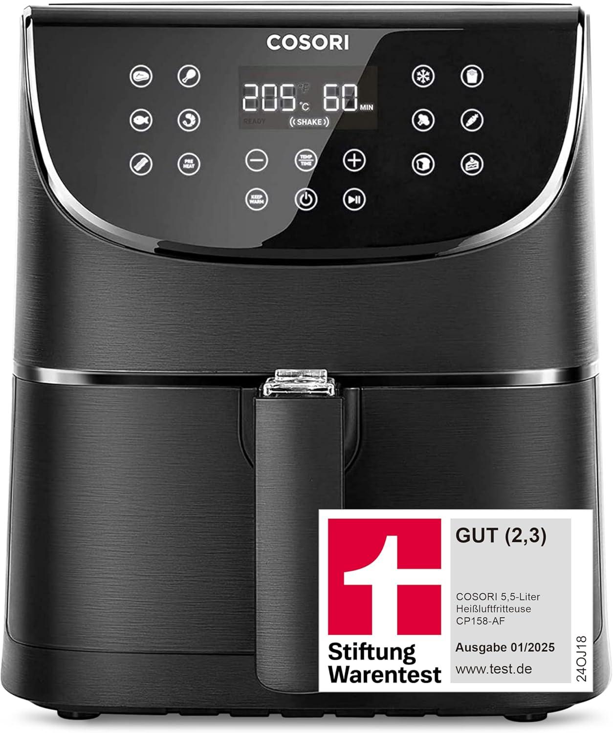 Zustand: Gebraucht - Heißluftfritteusen - COSORI - CP158-AF - EAN: 0810043371117 - [ðð®ðšðð«ðšðð¢ð¬ðœð¡ðžð¬ ðƒðžð¬ð¢ð ð§] COSORI rote Heißluftfritteuse, eleganter und modischer; Spezielles quadratisches Design, das besser auf Ihre Arbeitsplatte passt und Ihren Modegeschmack zeigt; Der 5,7L XXL quadratische Korb ist größer und bietet mehr Platz, um mehr Lebensmittel als der runde Designkorb auf den Markt zu bringen [ðŸ—ðŸ•, 👠ðð«ð¨ð³ðžð§ð ð°ðžð§ð¢ð ðžð« Öð¥] Die COSORI CP158-AF Heißluftfritteuse benötigt beim Pommes-Frittieren 97,3 Prozent weniger Öl als herkömmliche Fritteusen - für knusprige Pommes mit weniger Fett und mehr Geschmack [ðŸ±,ðŸ•ð—Ÿ ð—šð—¿ð—¼ßð—²ð˜€ ð—™ð—®ð˜€ð˜€ð˜‚ð—»ð—´ð˜€ð˜ƒð—²ð—¿ð—ºöð—´ð—²ð—»] Kann gleichzeitig für die ganze Familie kochen - einfache Essenszubereitung für Familientreffen [ðƒð¢ð ð¢ððšð¥ðžð¬ ð‹ð„ðƒ ðƒð¢ð¬ð©ð¥ðšð²] Das übersichtliche LED-Display verfügt über 11 vorprogrammierte Einstellungen, welche per Touchscreen ausgwählt werden können; Sie bereiten ihr Lieblingsgericht mit nur einem Knopfdruck zu und können sich während dem Kochvorgang anderen Dingen widmen; Es besteht außerdem die Möglichkeit, die Temperatur (75-205°C) und die Zubereitungszeit (bis zu 60 Minuten) manuell einzustellen; Kochen war nie einfacher [ð—ð—ð‹ ð ðšð¬ð¬ð®ð§ð ð¬ð¯ðžð«ð¦öð ðžð§] Die ... Diese weiße Heißluftfritteuse ist ebenfalls ein Testsieger 2024 und punktet mit Energiesparfunktionen und Rezepten. ![]() ![]() COSORI Heißluftfritteuse CP158-AF, Testsieger 2024 Stiftung Warentest, 11-in-1 Airfryer mit Shake-Reminder, 100 Rezepte, 55 Prozent energiesparend, spülmaschinenfeste Körbe, Weiß
